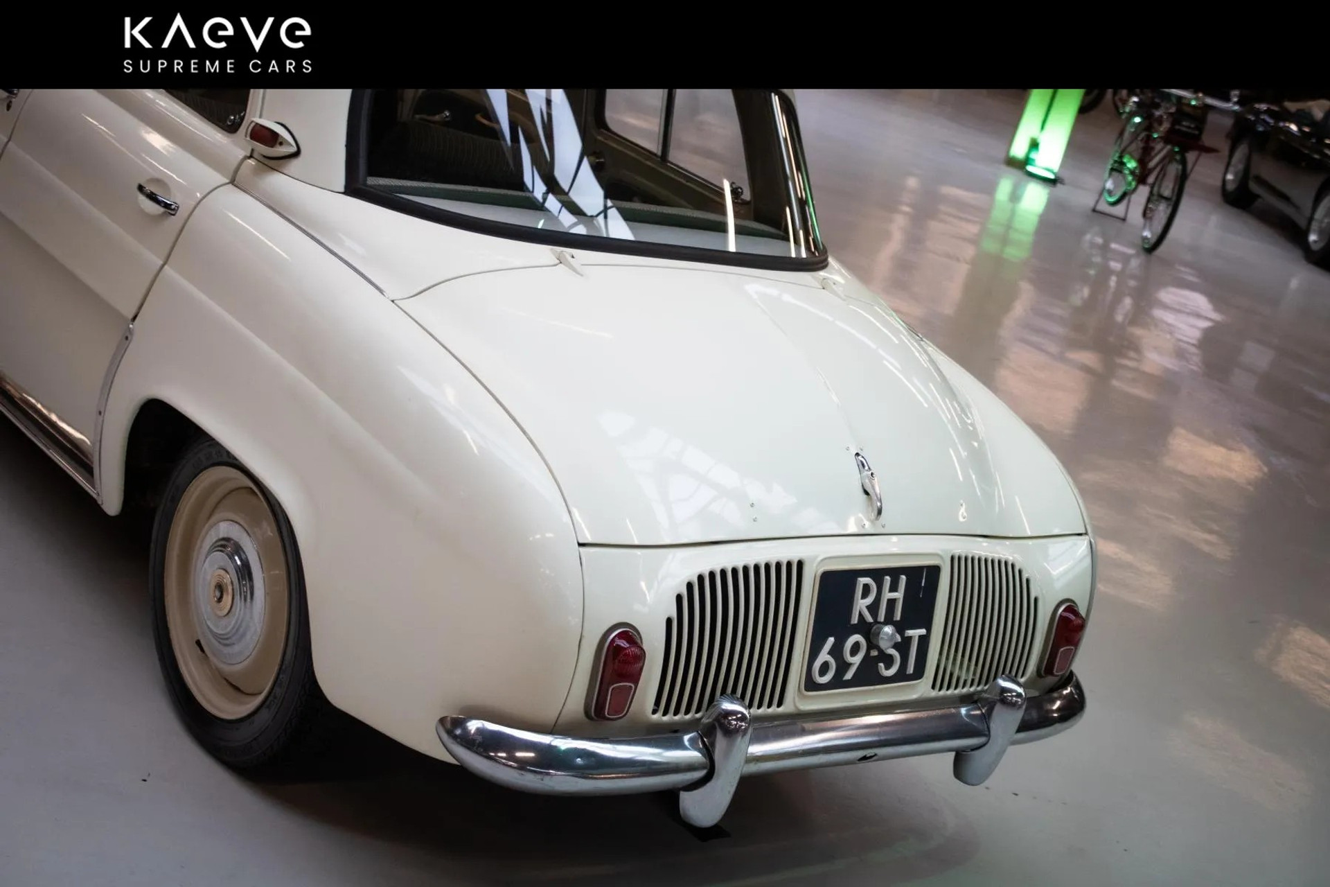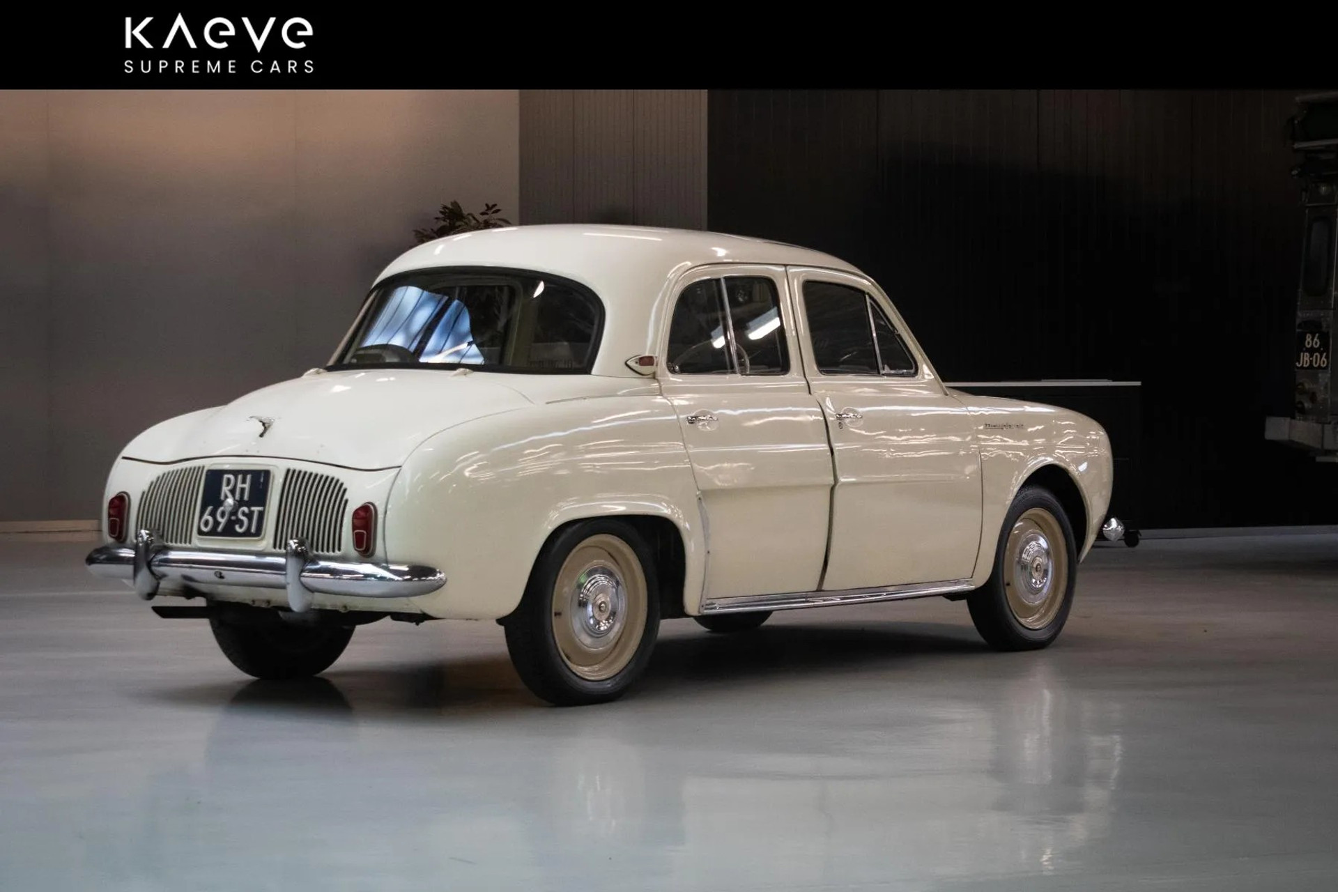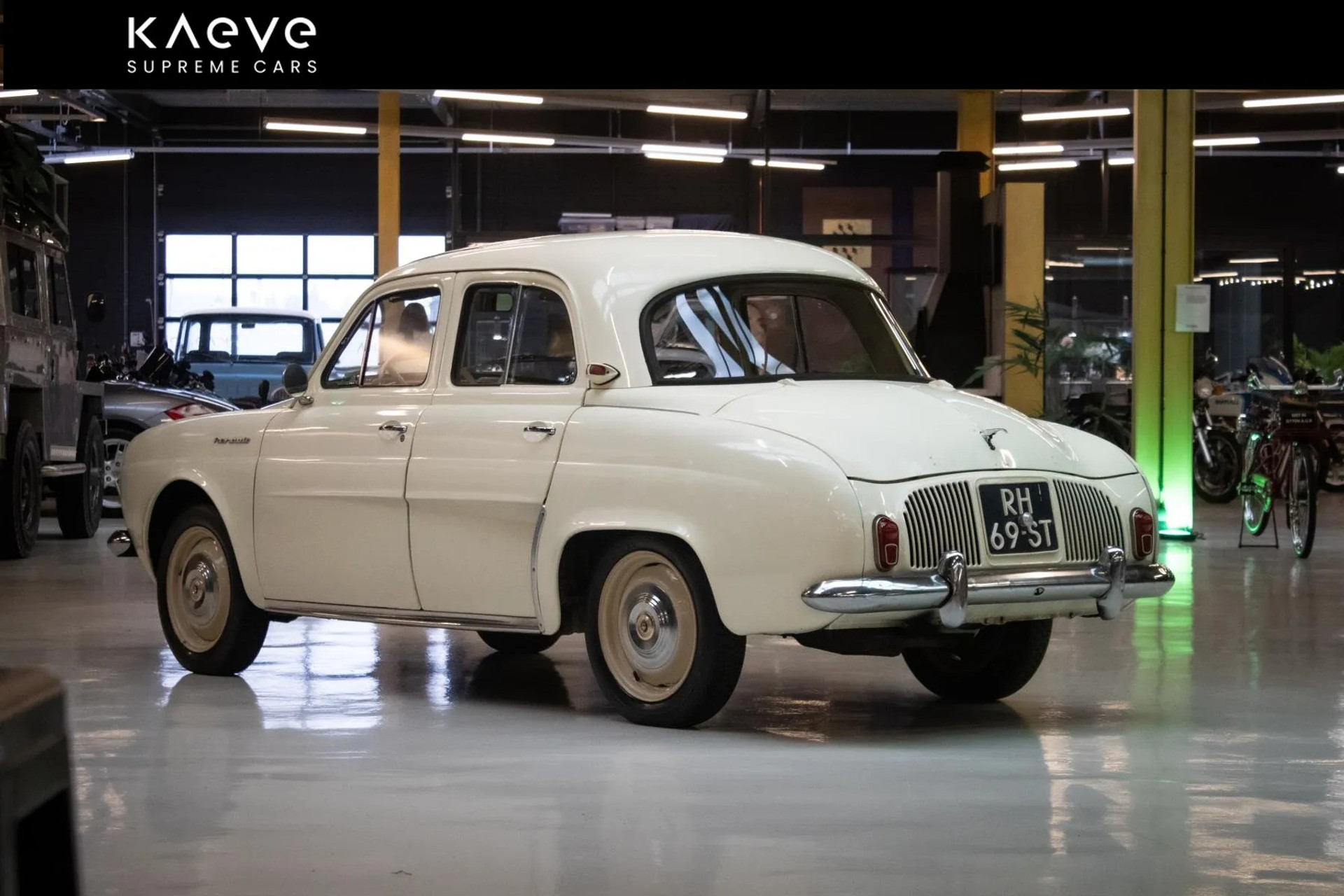 A beautiful white Renault Dauphine with only 42,043 kilometers on the odometer. This classic car, with license plate RH-69-ST, has been well cared for and features a manual transmission. It is a lovely oldtimer, perfect for leisurely drives and car shows.