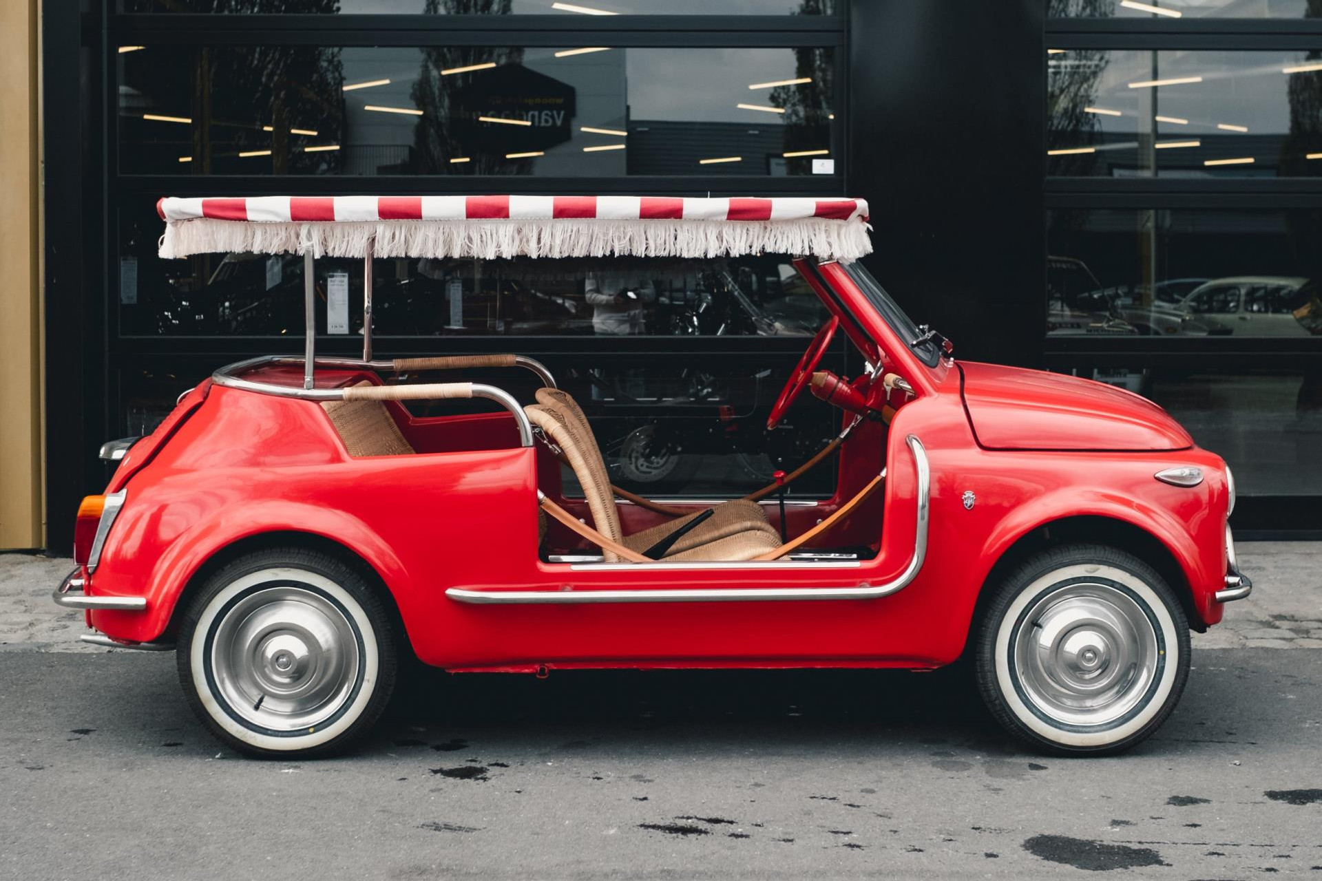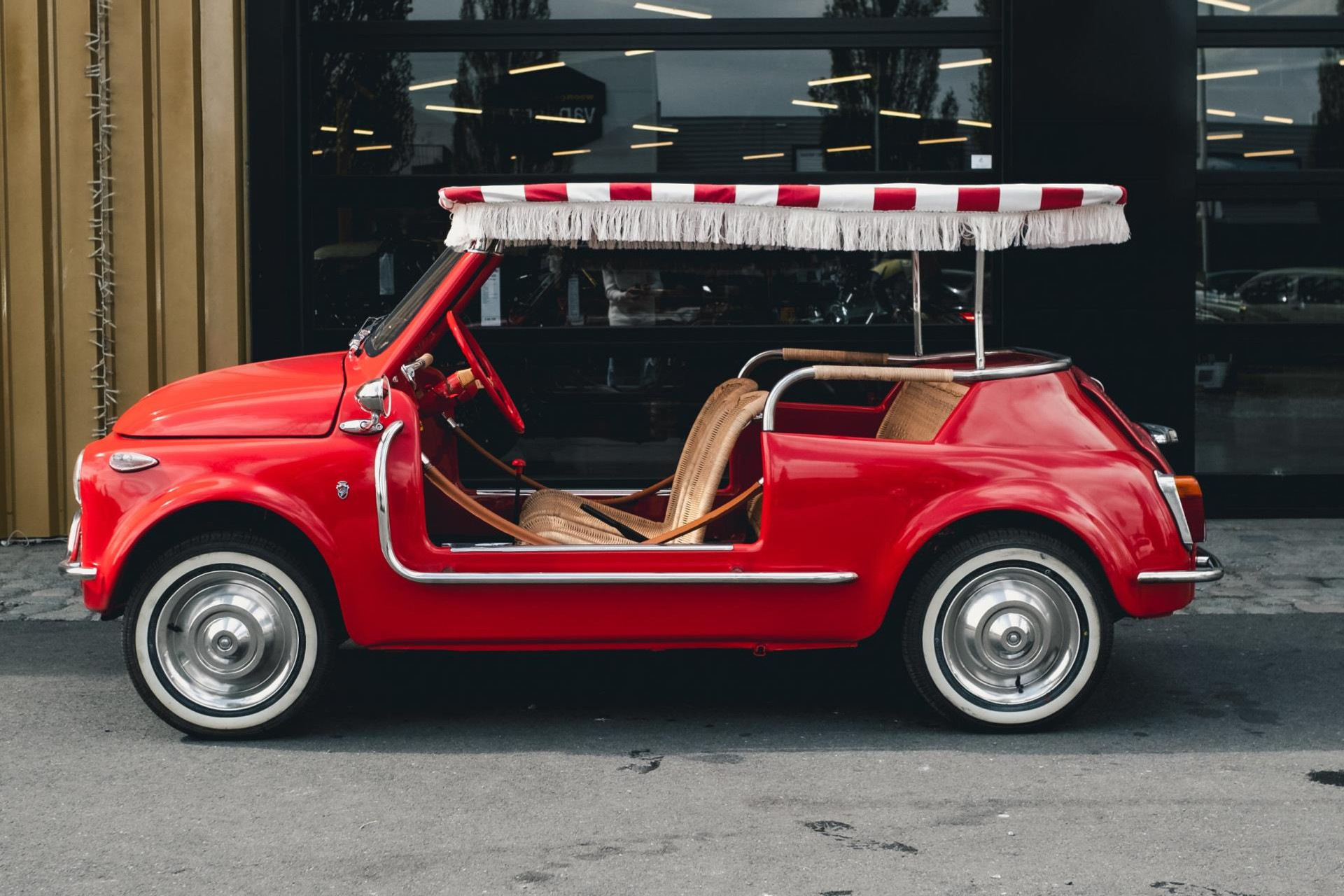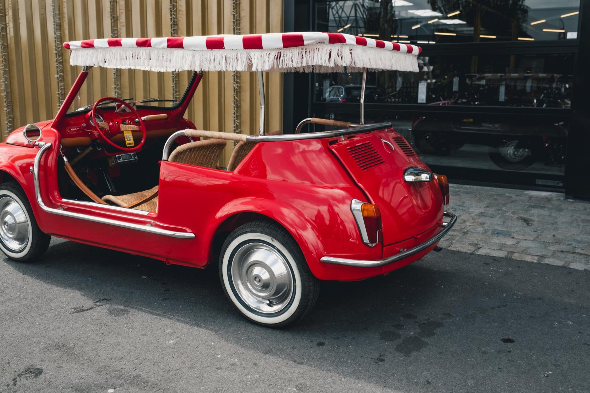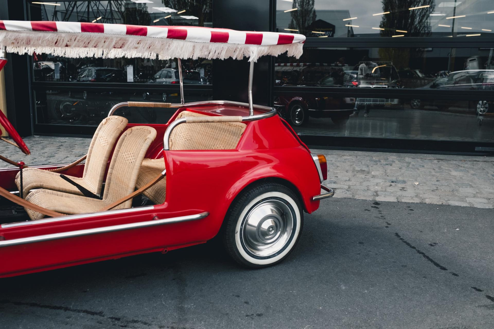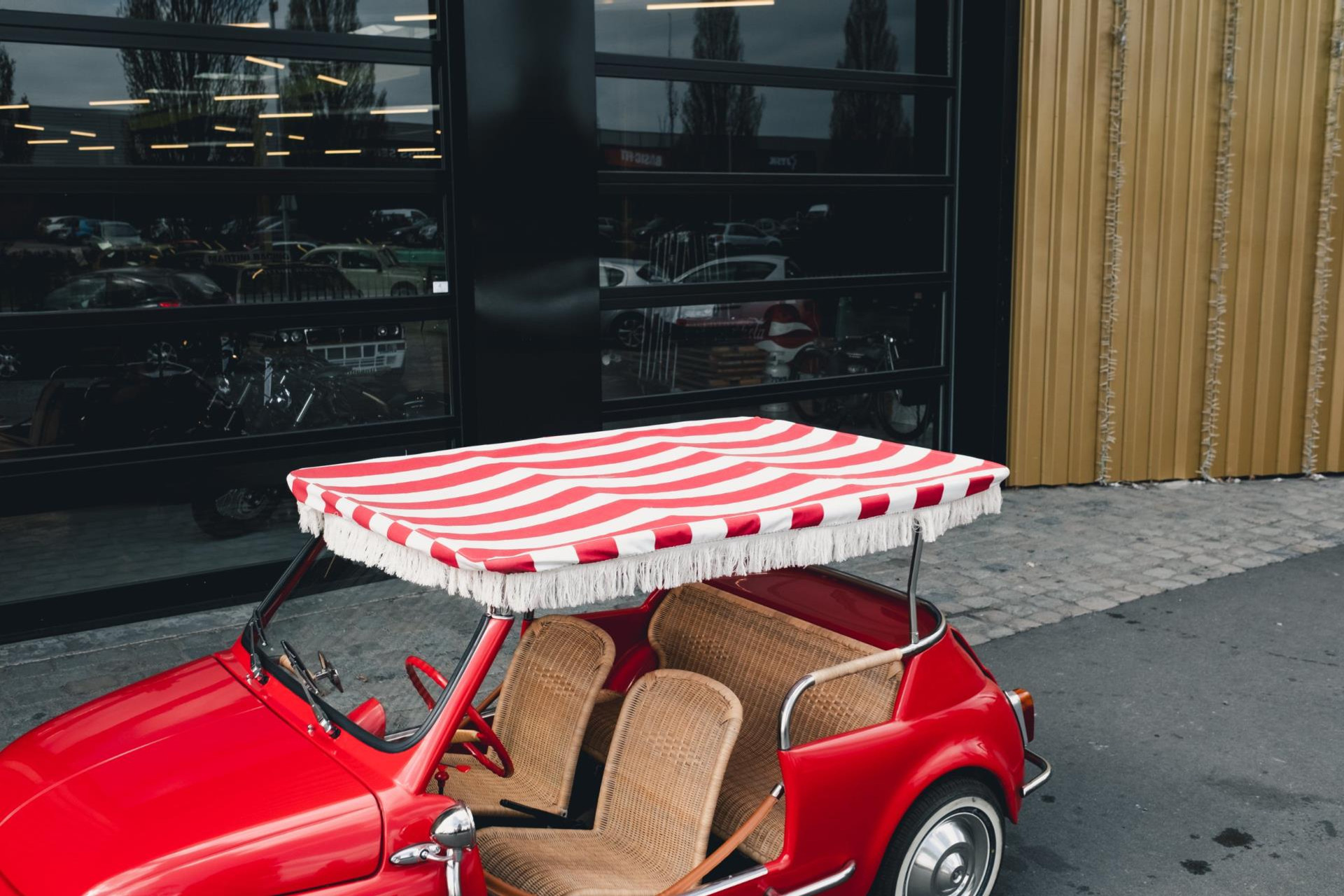 De auto is gespoten in een prachtige zachte roodtint met een vleugje perzik — een kleur die perfect past bij het zomerse karakter van deze klassieke Fiat. Het interieur is voorzien van stijlvolle rieten stoelen en een speels zonnedakje met witte franjes, helemaal in lijn met de iconische Jolly-stijl.