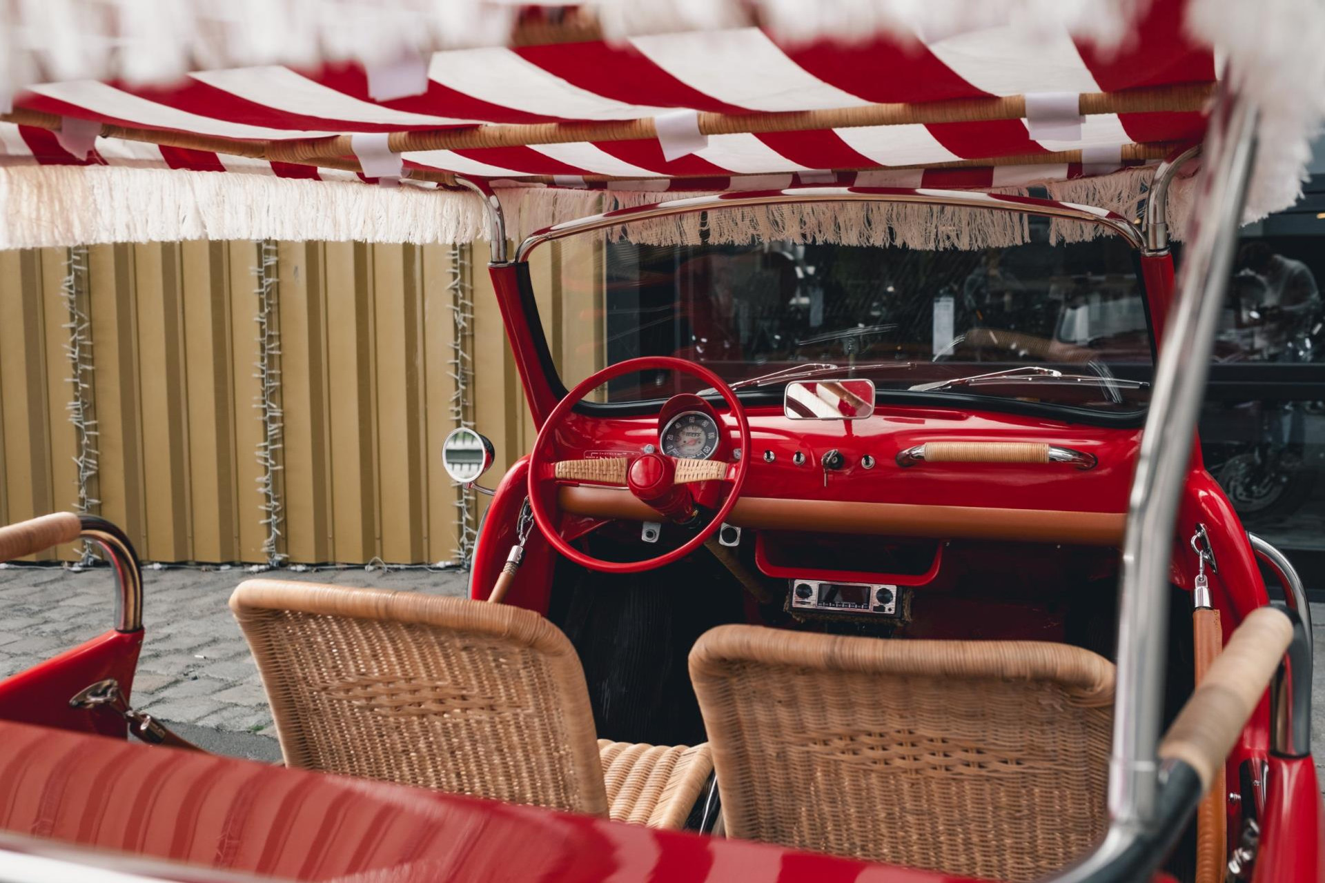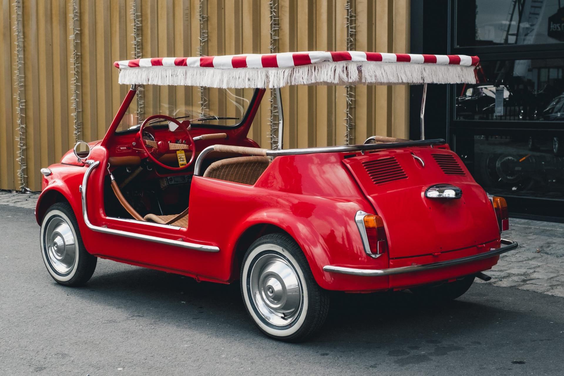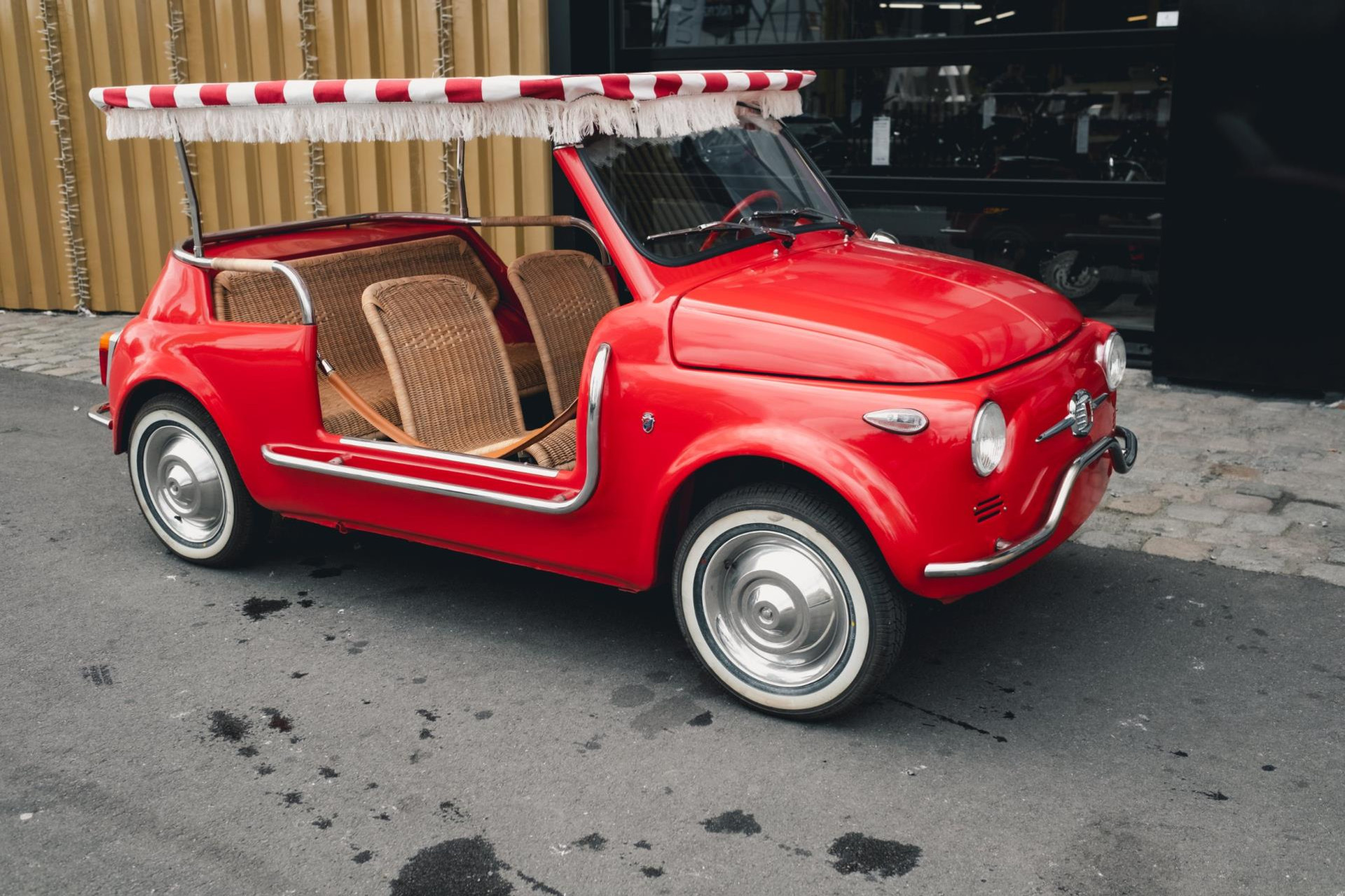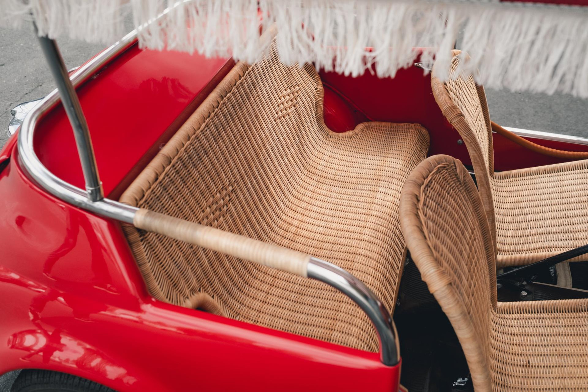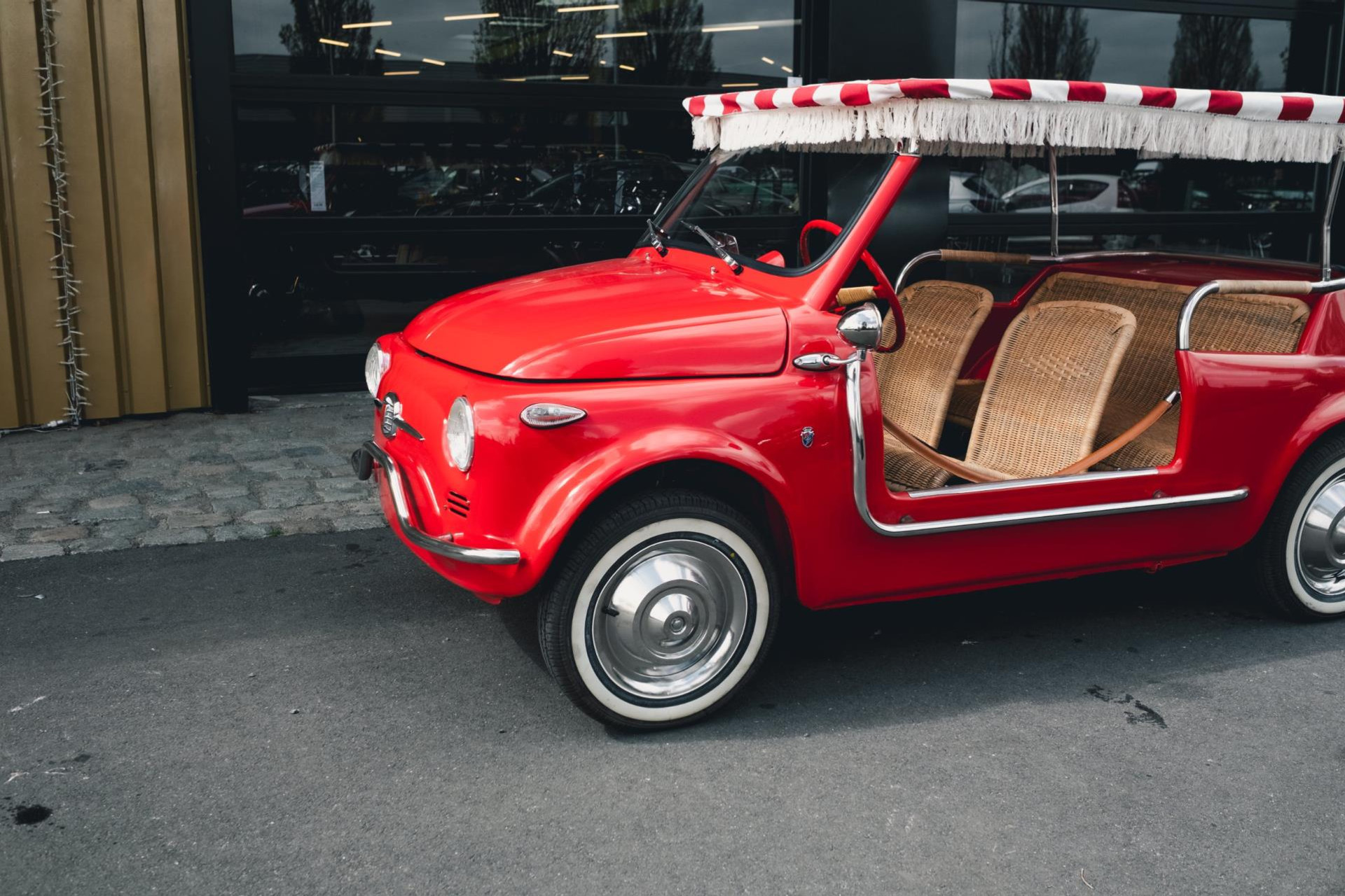 De auto is gespoten in een prachtige zachte roodtint met een vleugje perzik — een kleur die perfect past bij het zomerse karakter van deze klassieke Fiat. Het interieur is voorzien van stijlvolle rieten stoelen en een speels zonnedakje met witte franjes, helemaal in lijn met de iconische Jolly-stijl.