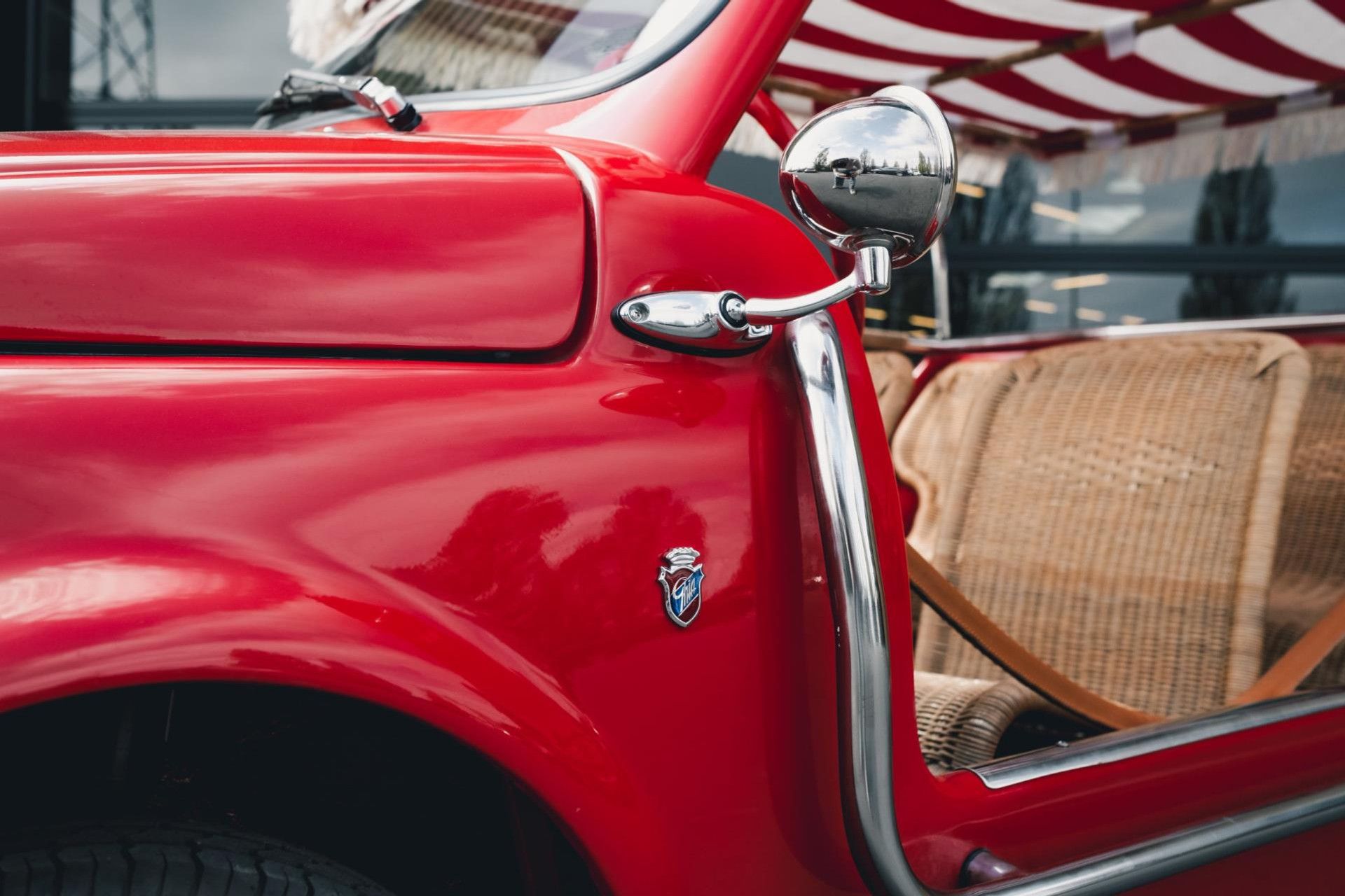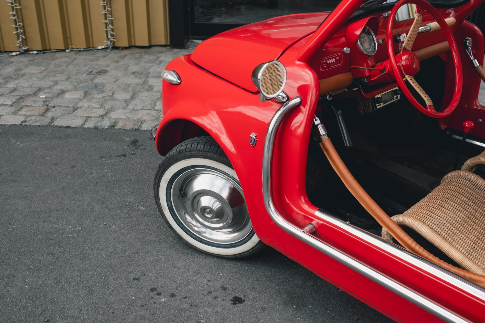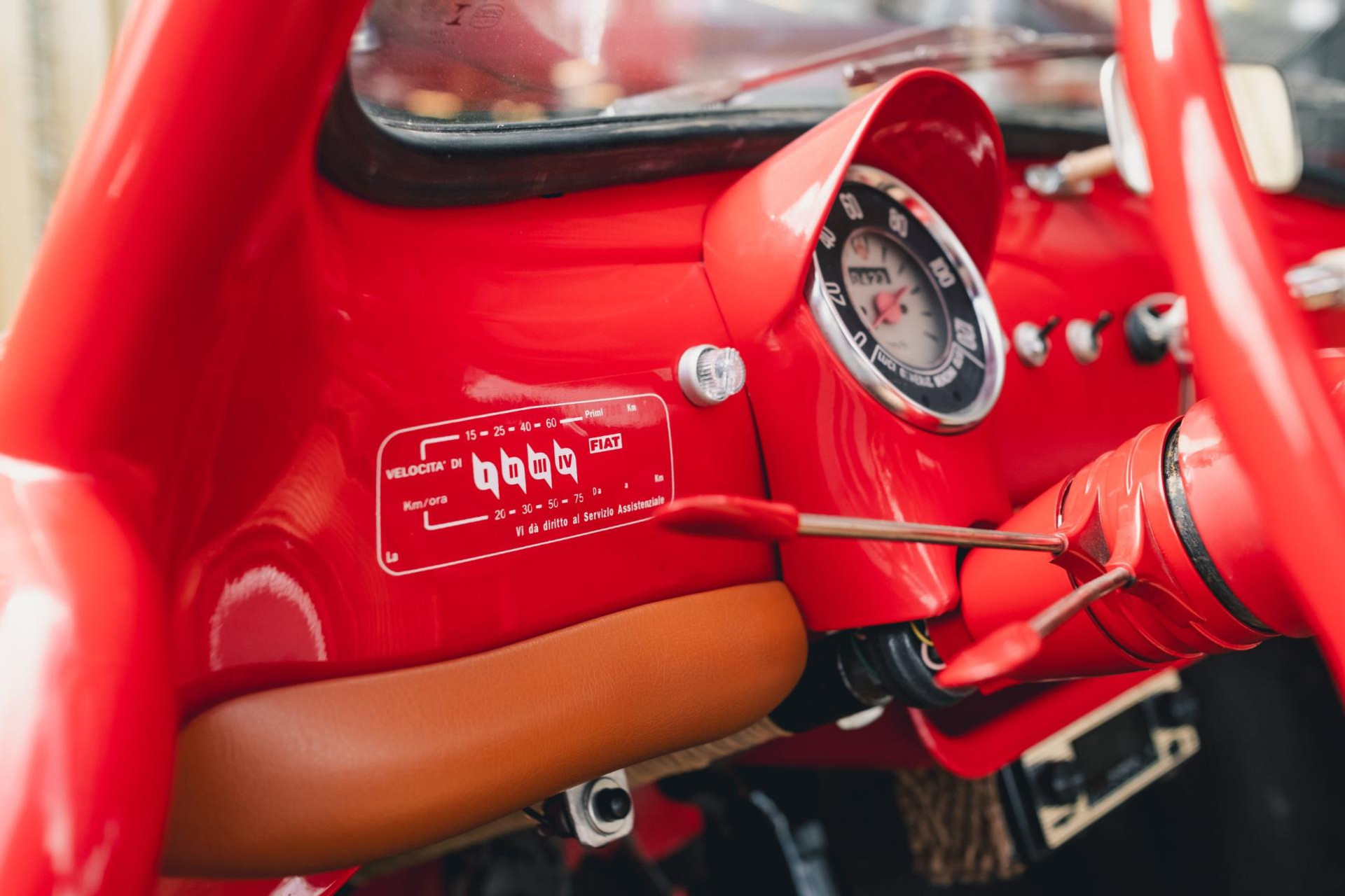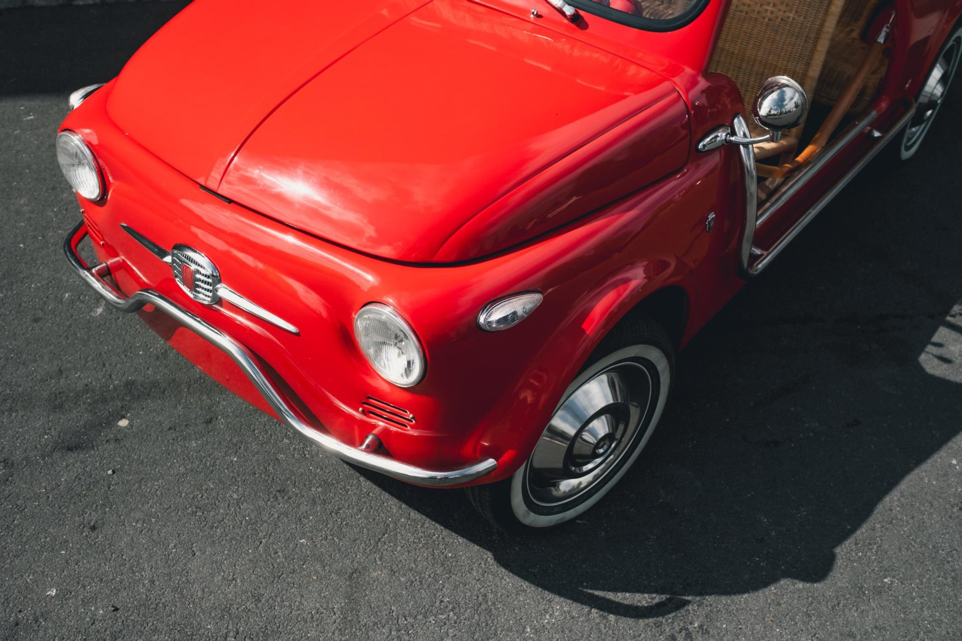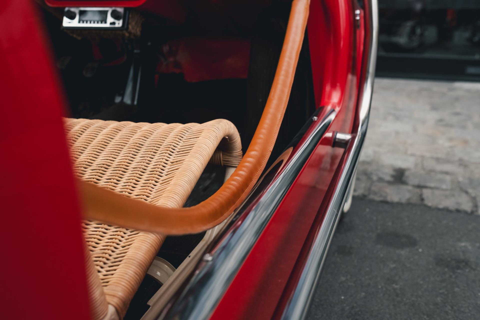 De auto is gespoten in een prachtige zachte roodtint met een vleugje perzik — een kleur die perfect past bij het zomerse karakter van deze klassieke Fiat. Het interieur is voorzien van stijlvolle rieten stoelen en een speels zonnedakje met witte franjes, helemaal in lijn met de iconische Jolly-stijl.