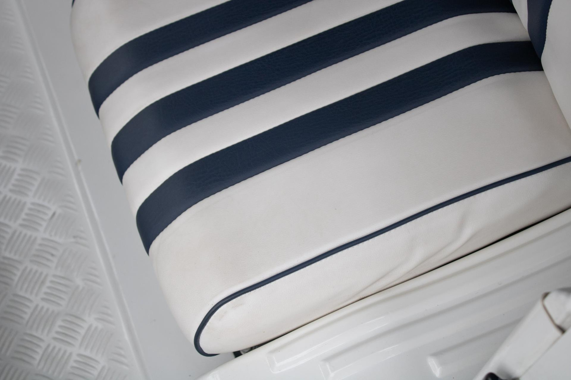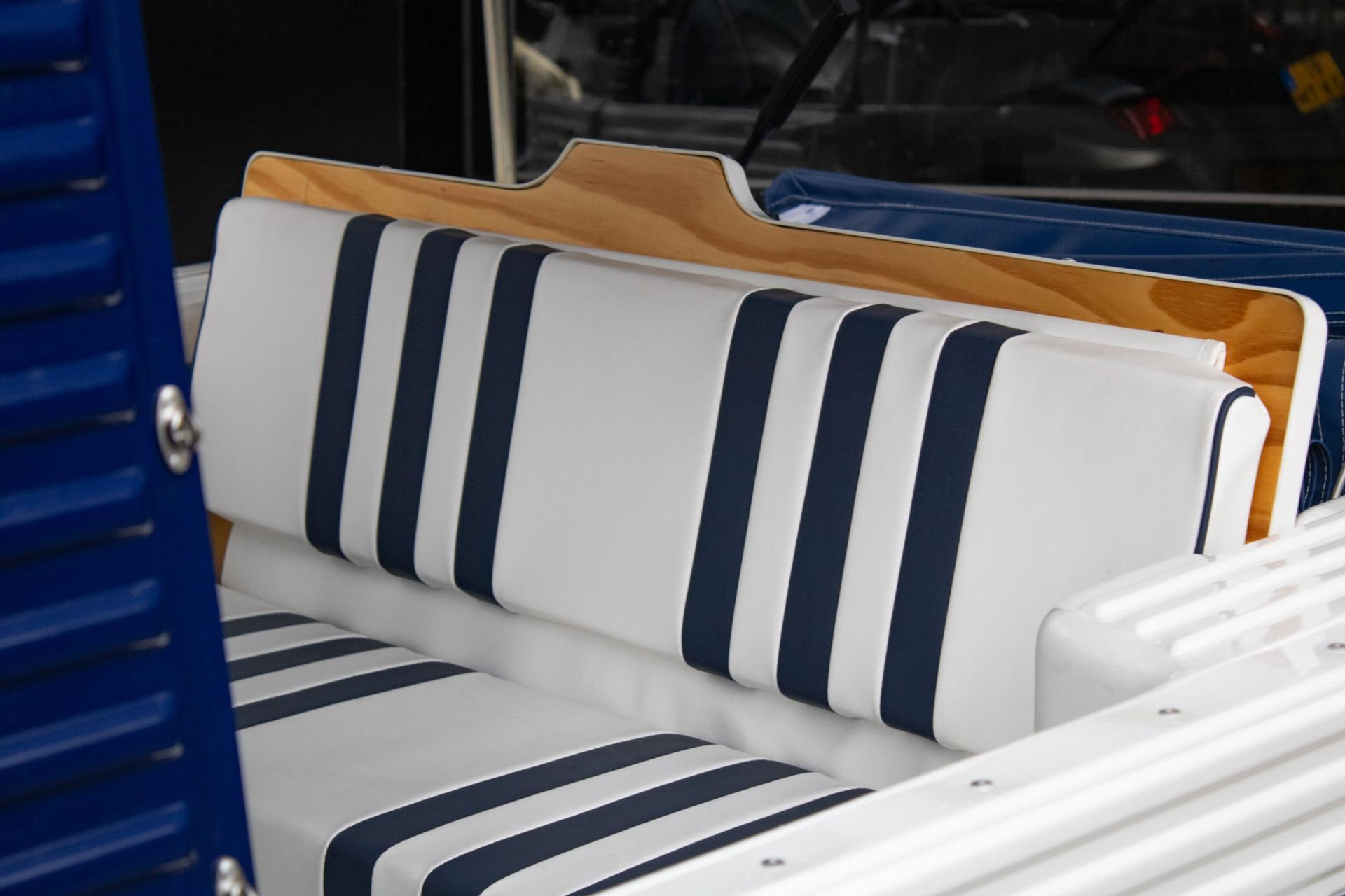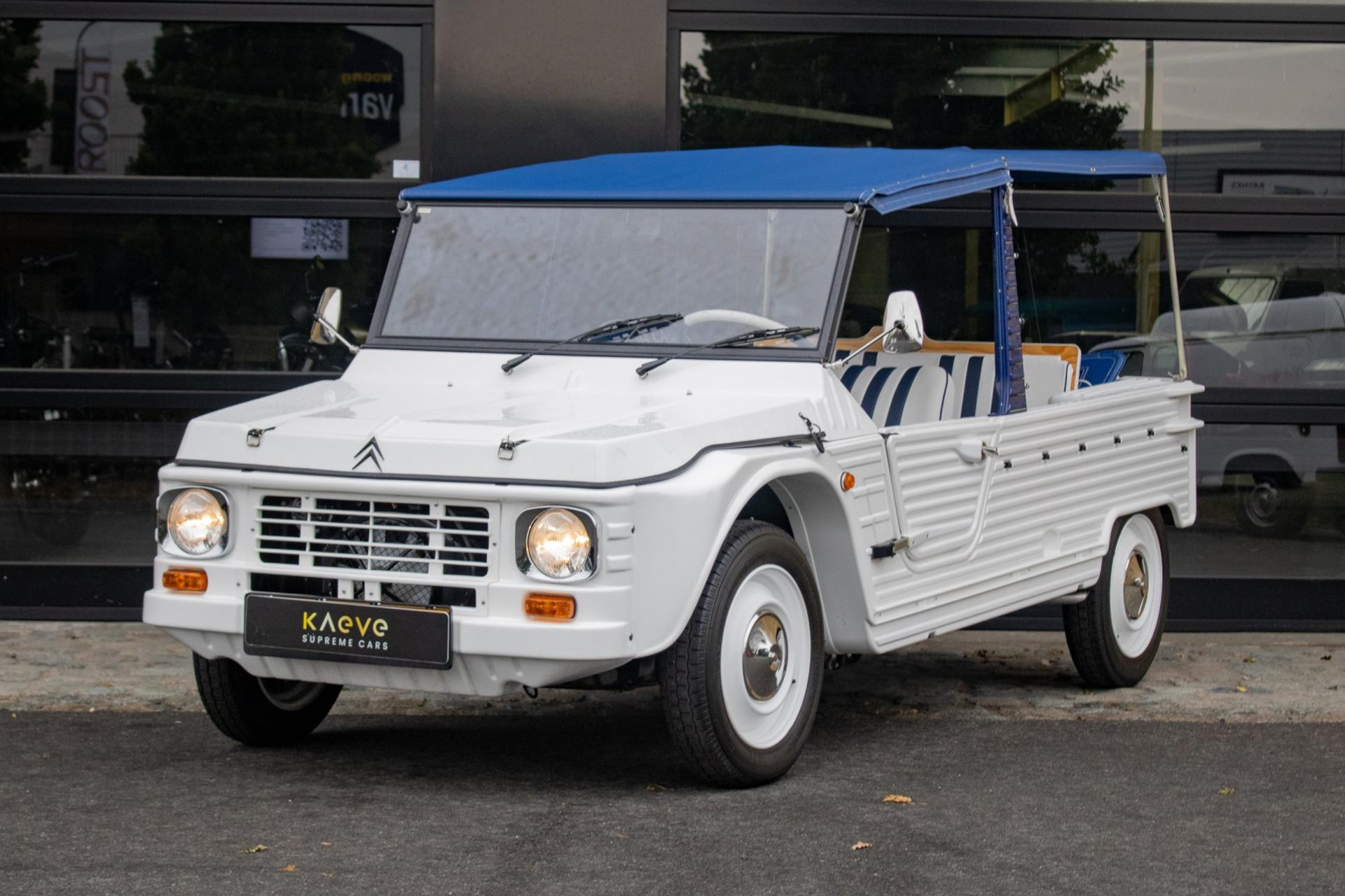 For sale: 1980 Citroën Méhari, finished in white with a blue and white striped interior and a matching blue hood. This classic Méhari has driven just 40,000 kilometres and is in excellent condition. Complete and well maintained, an excellent representative of this iconic model.