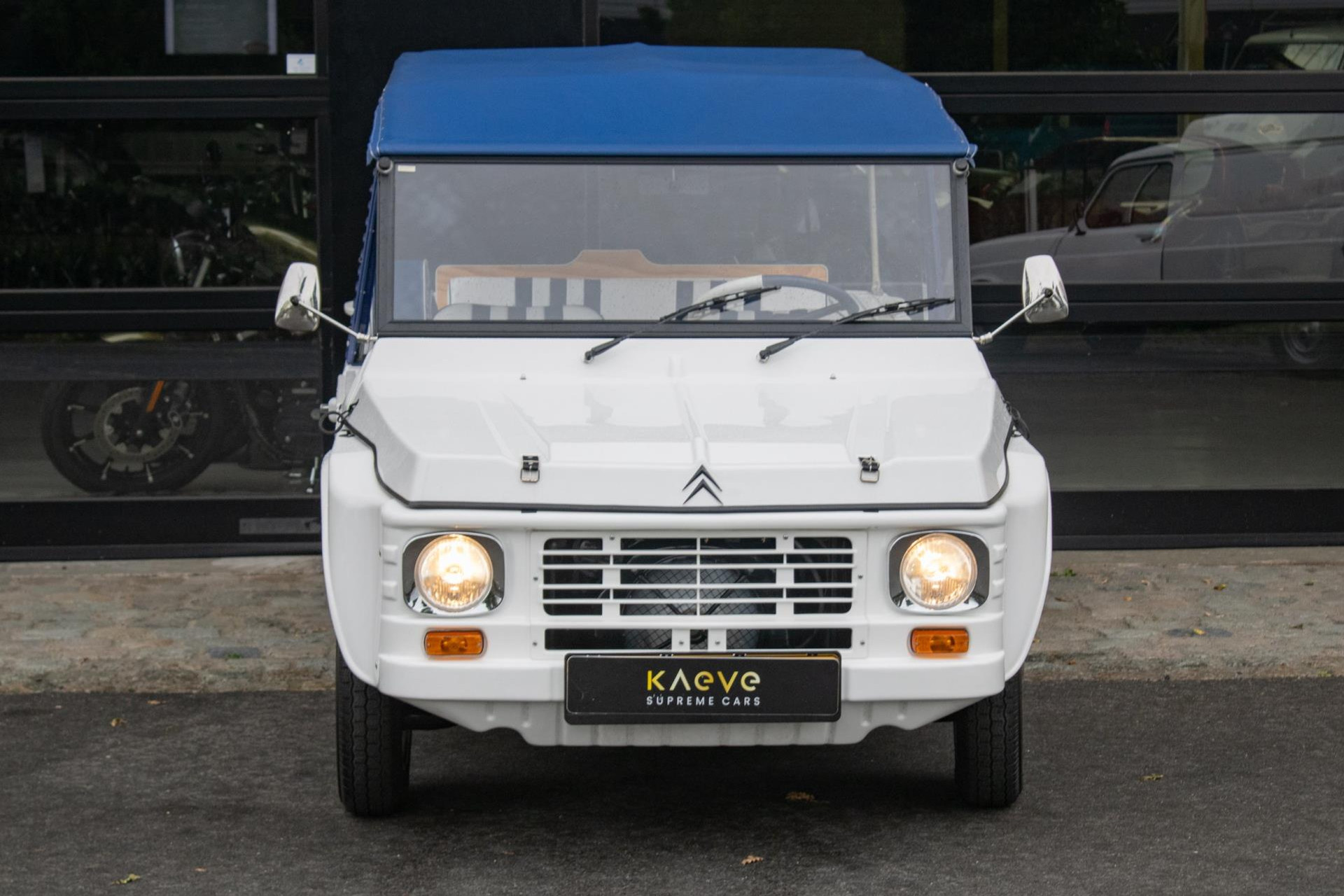 Zu verkaufen: 1980 Citroën Méhari in weiß mit blau-weiß gestreifter Innenausstattung und passendem blauen Verdeck. Dieser klassische Méhari hat nur 40.000 Kilometer zurückgelegt und befindet sich in einem ausgezeichneten Zustand. Vollständig und gut gepflegt, ein hervorragender Vertreter dieses kultigen Modells.