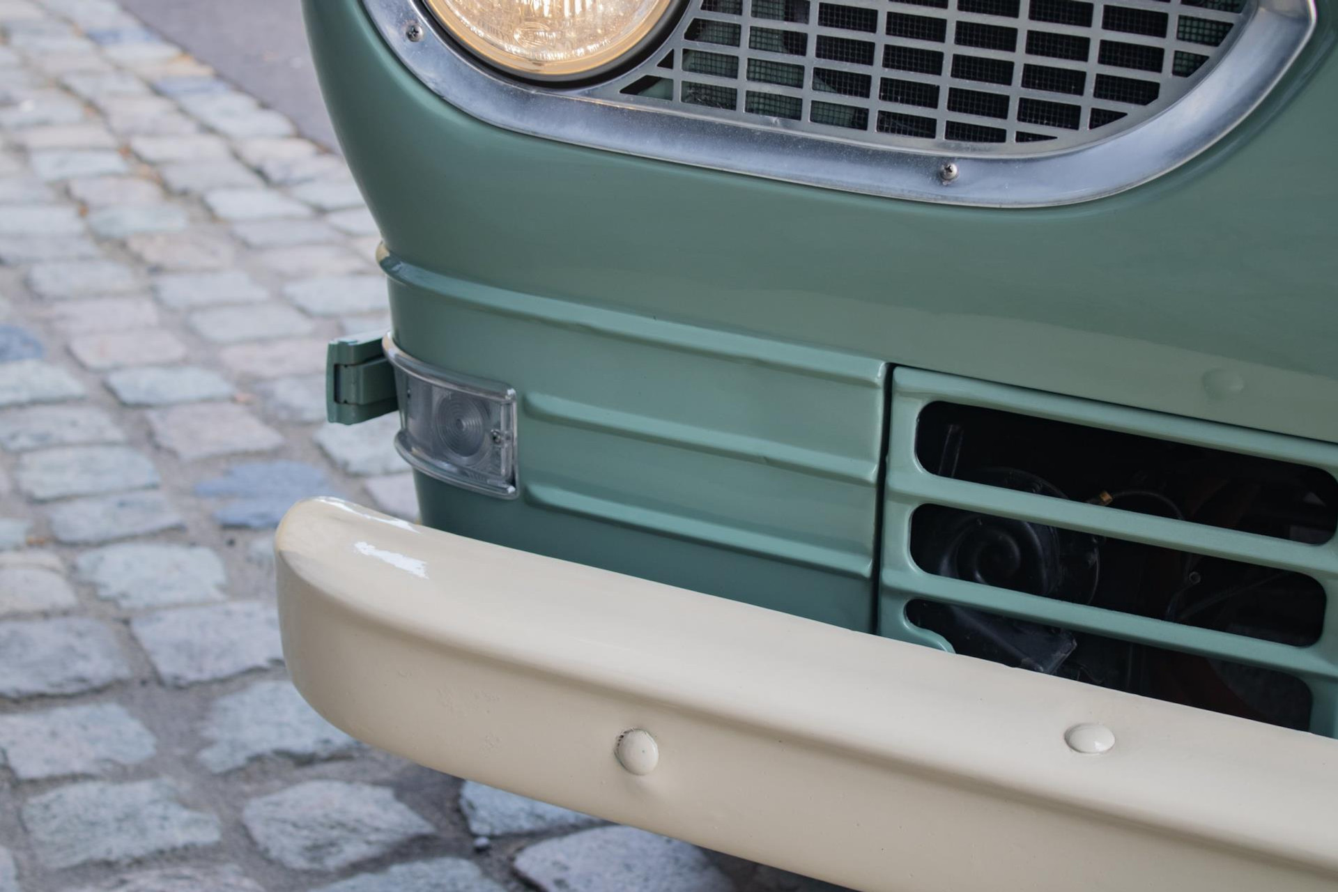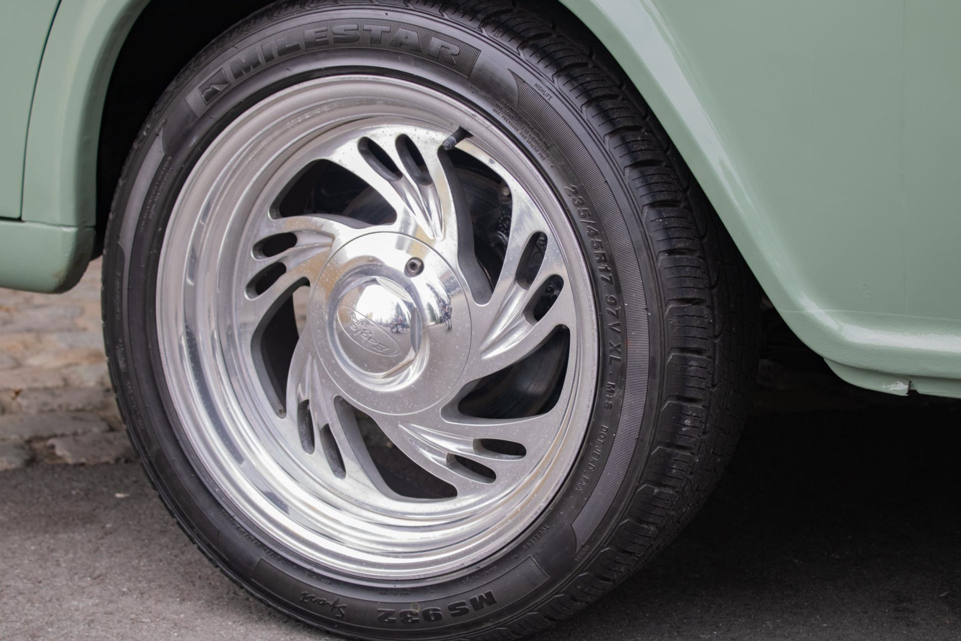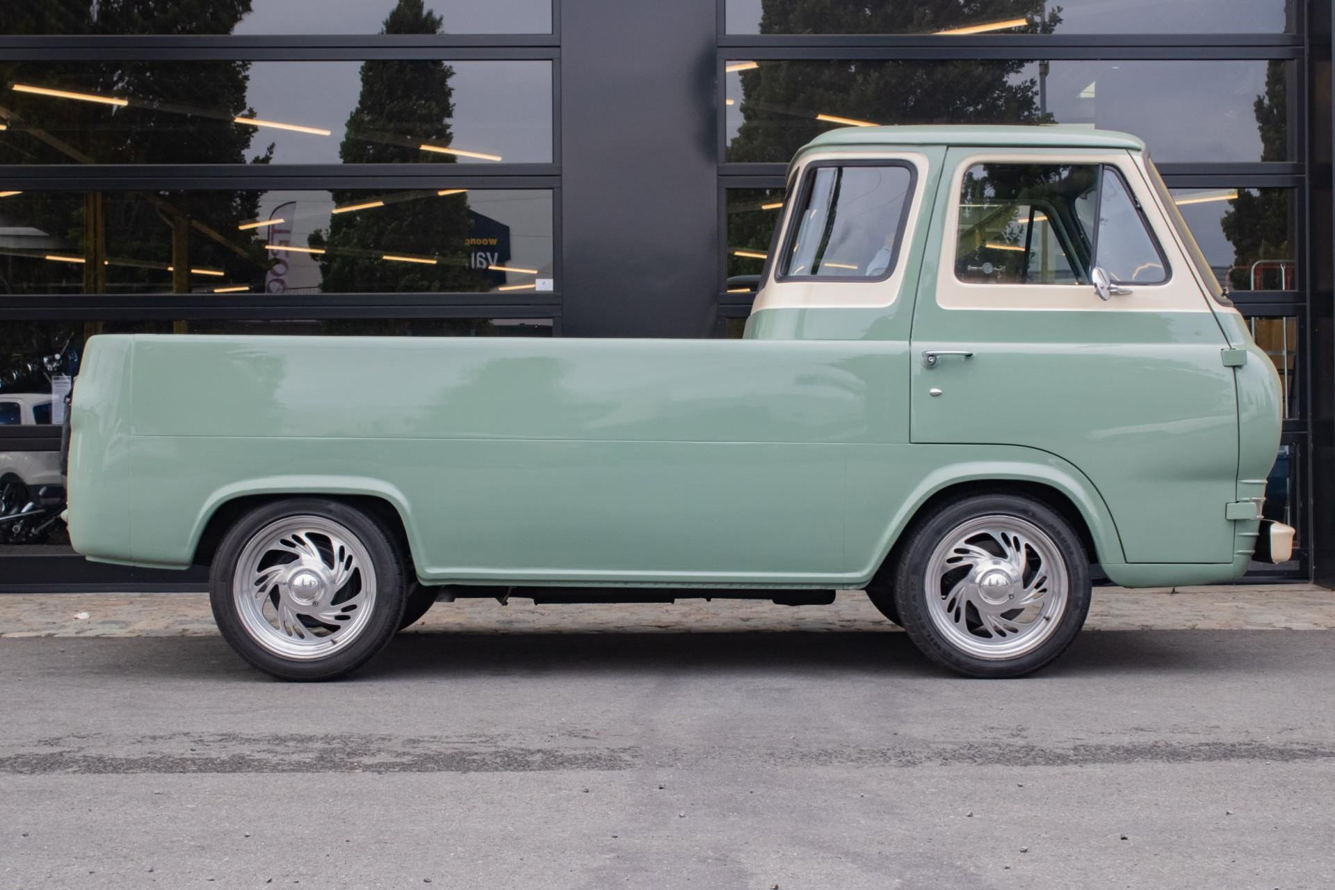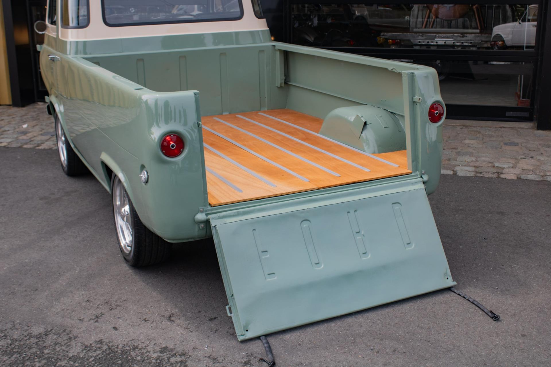 Die Lackierung ist in einem stilvollen hellen Olivgrün gehalten, das schön mit weißen Akzenten kombiniert ist, die die klassischen Linien betonen. Der Laderaum wurde mit Holzteilen und Aluminiumleisten komplett neu aufgebaut, was ihm einen handwerklichen und hochwertigen Look verleiht. Der Pick-up ist mit Leichtmetallrädern von Eagle Alloys und verchromten Spiegeln ausgestattet, die seinen Retro-Charakter noch unterstreichen.