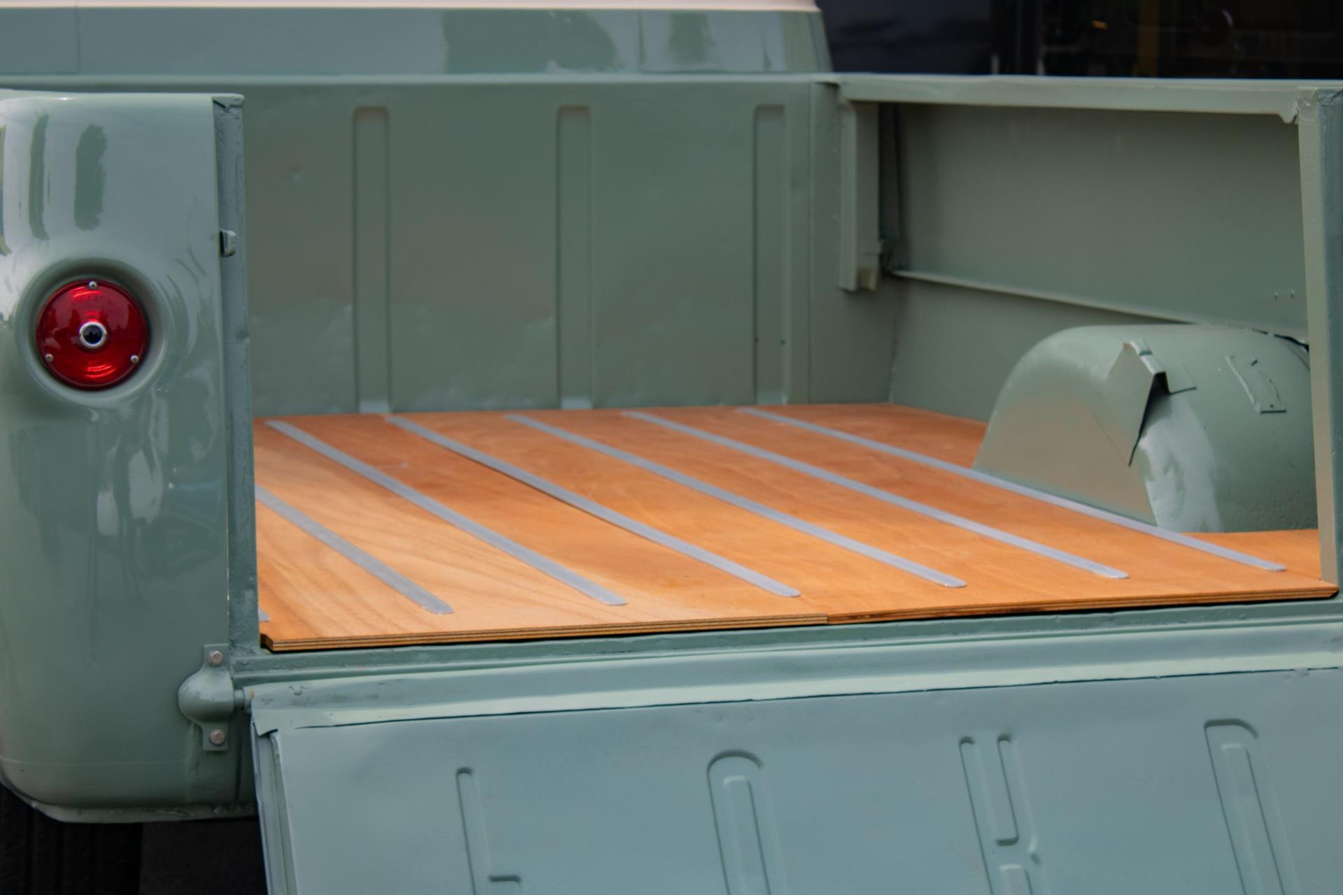 De lak is uitgevoerd in een stijlvolle lichte olijfgroene kleur, fraai gecombineerd met witte accenten die het klassieke lijnenspel benadrukken. De laadbak is volledig opnieuw opgebouwd met houtdelen en aluminium strips, wat zorgt voor een ambachtelijke en hoogwaardige uitstraling. Als finishing touch is deze pick-up voorzien van Eagle Alloys lichtmetalen velgen en verchroomde spiegels, die het retro-karakter versterken.