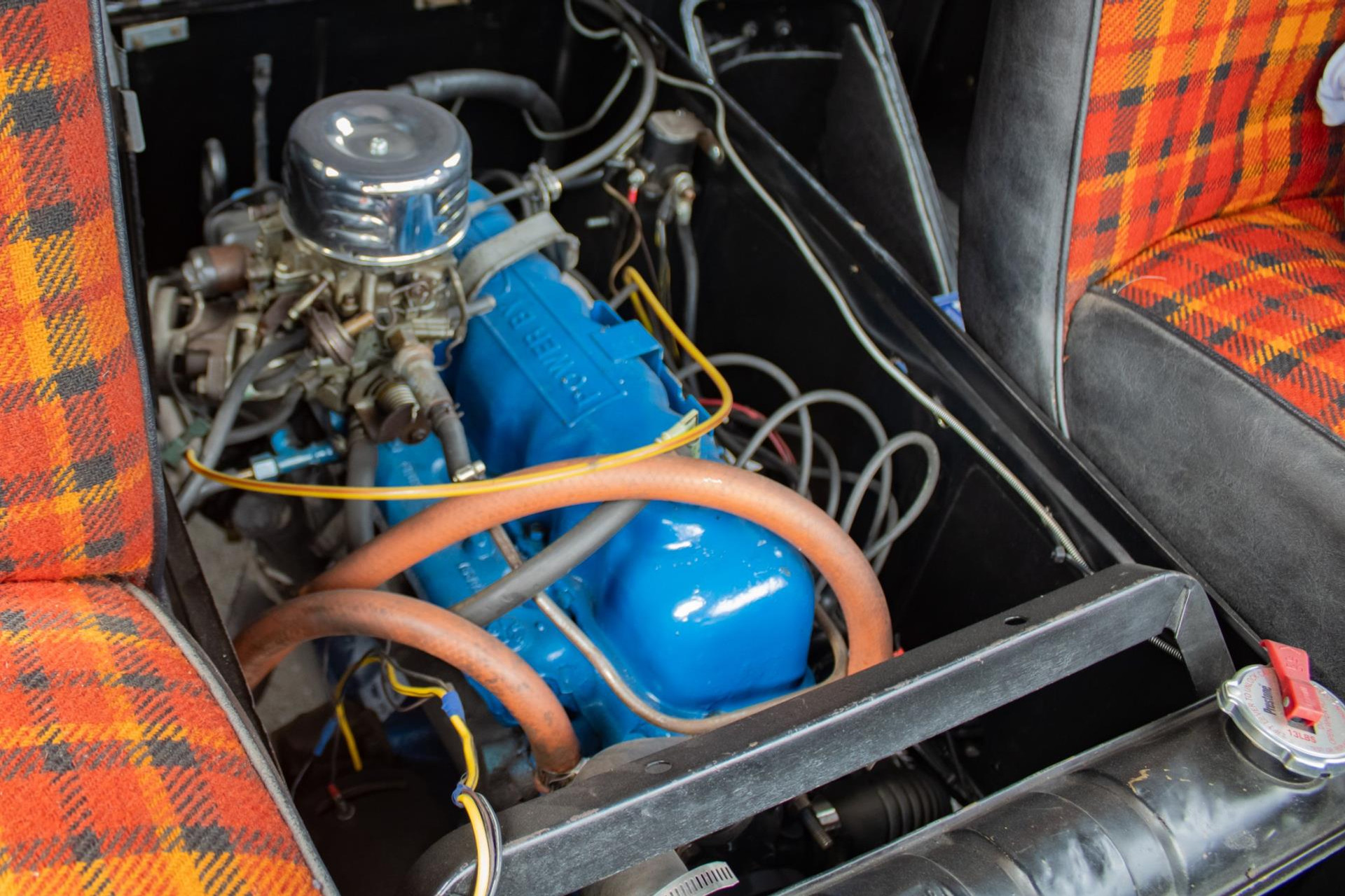 Im Innenraum finden wir eine originelle, aber einzigartige Ausstattung mit Tartan-Polstern in Orange, Rot und Schwarz - eine Anspielung auf die 1960er Jahre, aber mit einem frischen, individuellen Touch. Alles ist sehr gepflegt und funktionell.