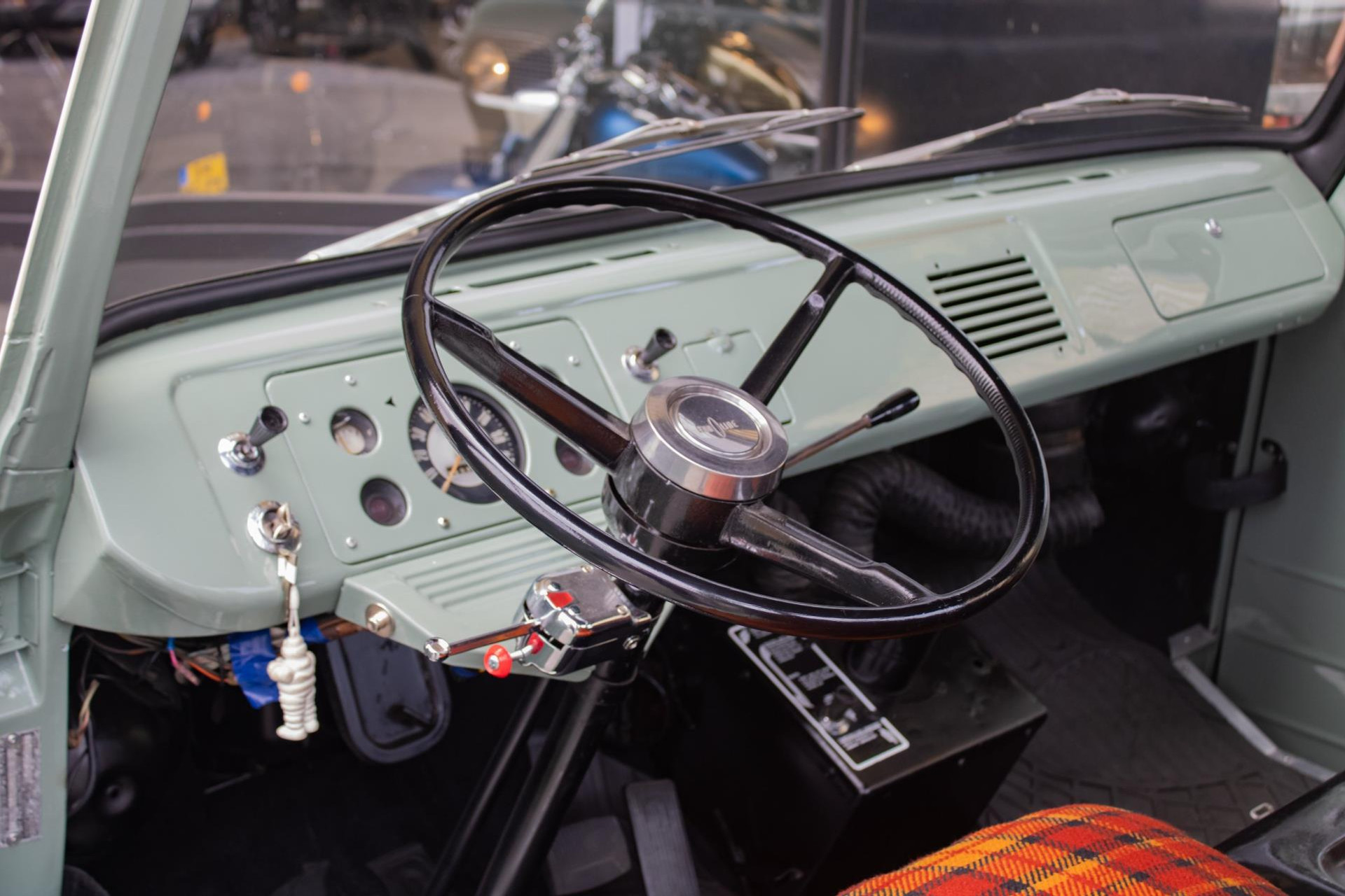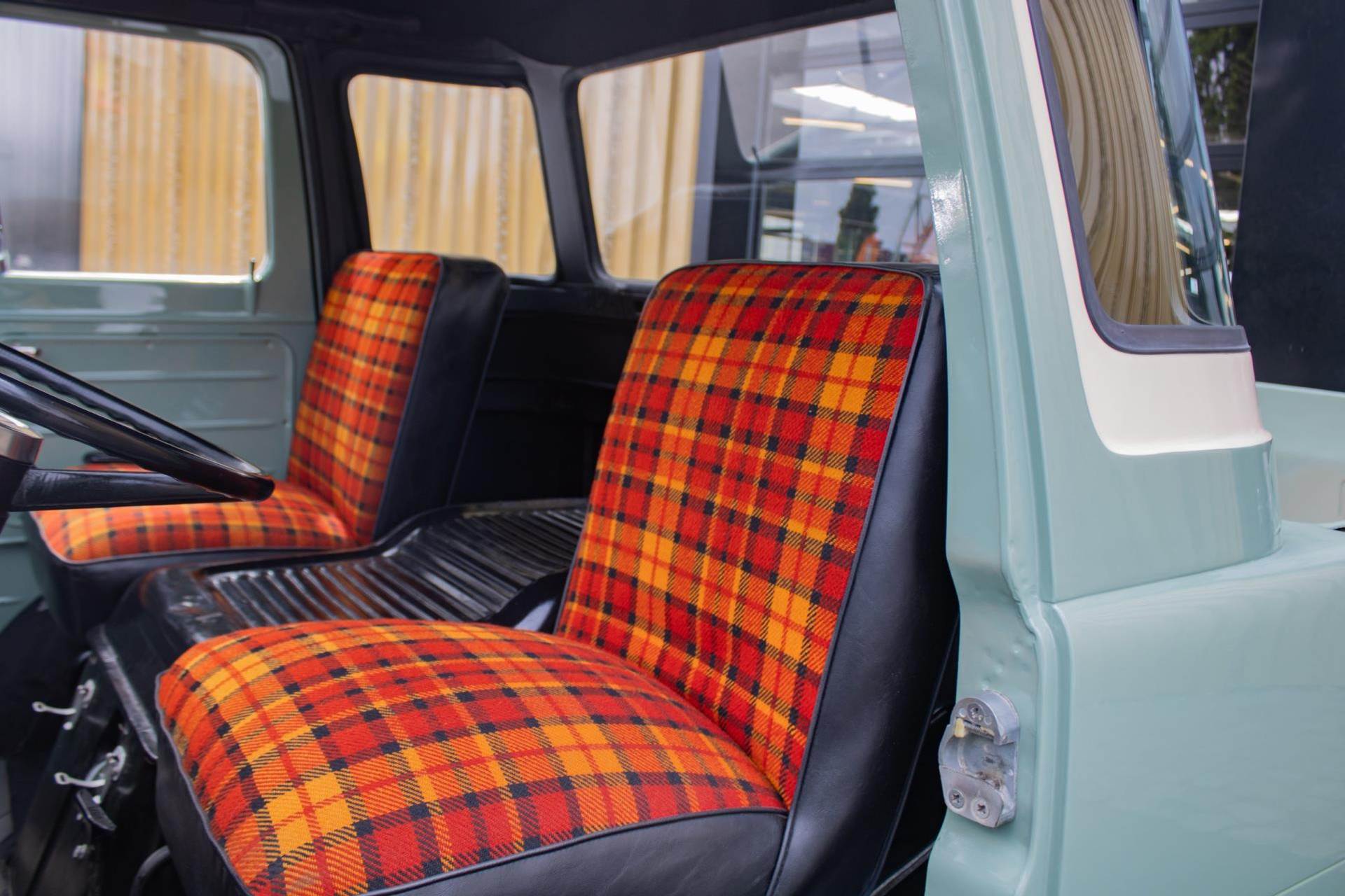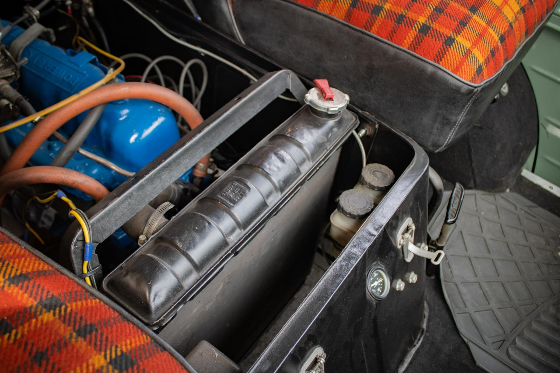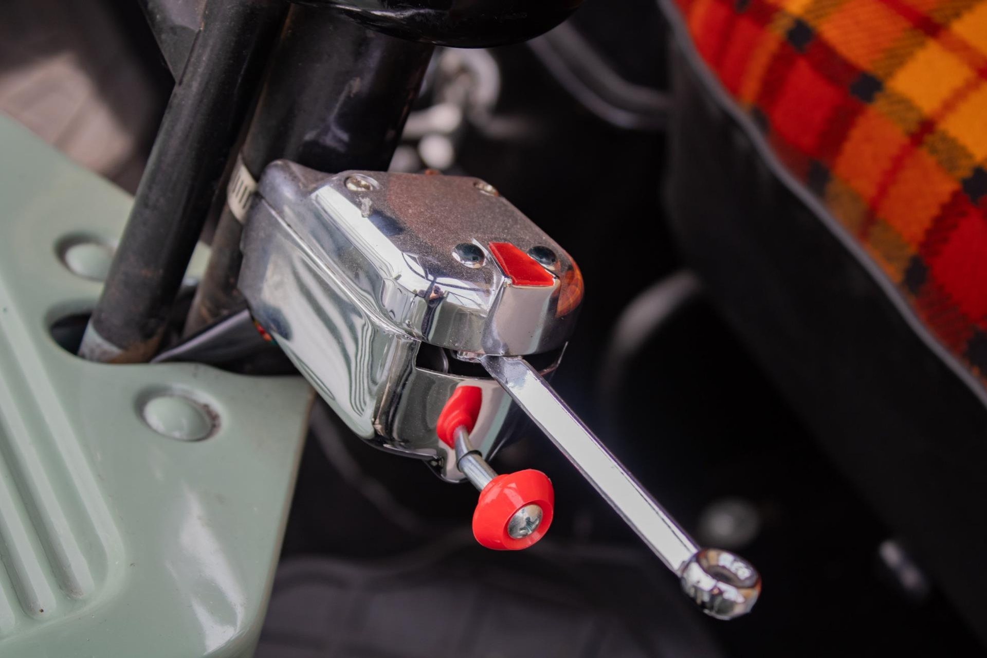 Inside, we find an original-looking but unique finish with tartan upholstery in orange, red and black - a nod to the 1960s but with a fresh custom twist. Everything is neatly groomed and functional.