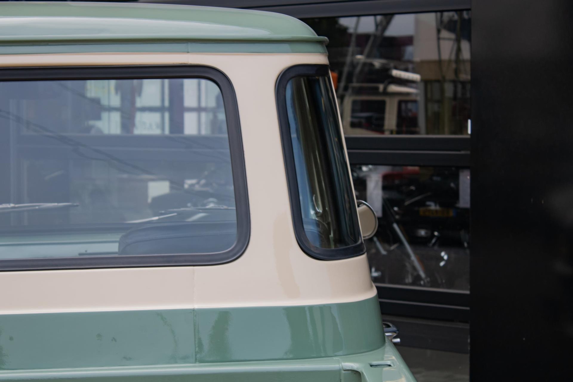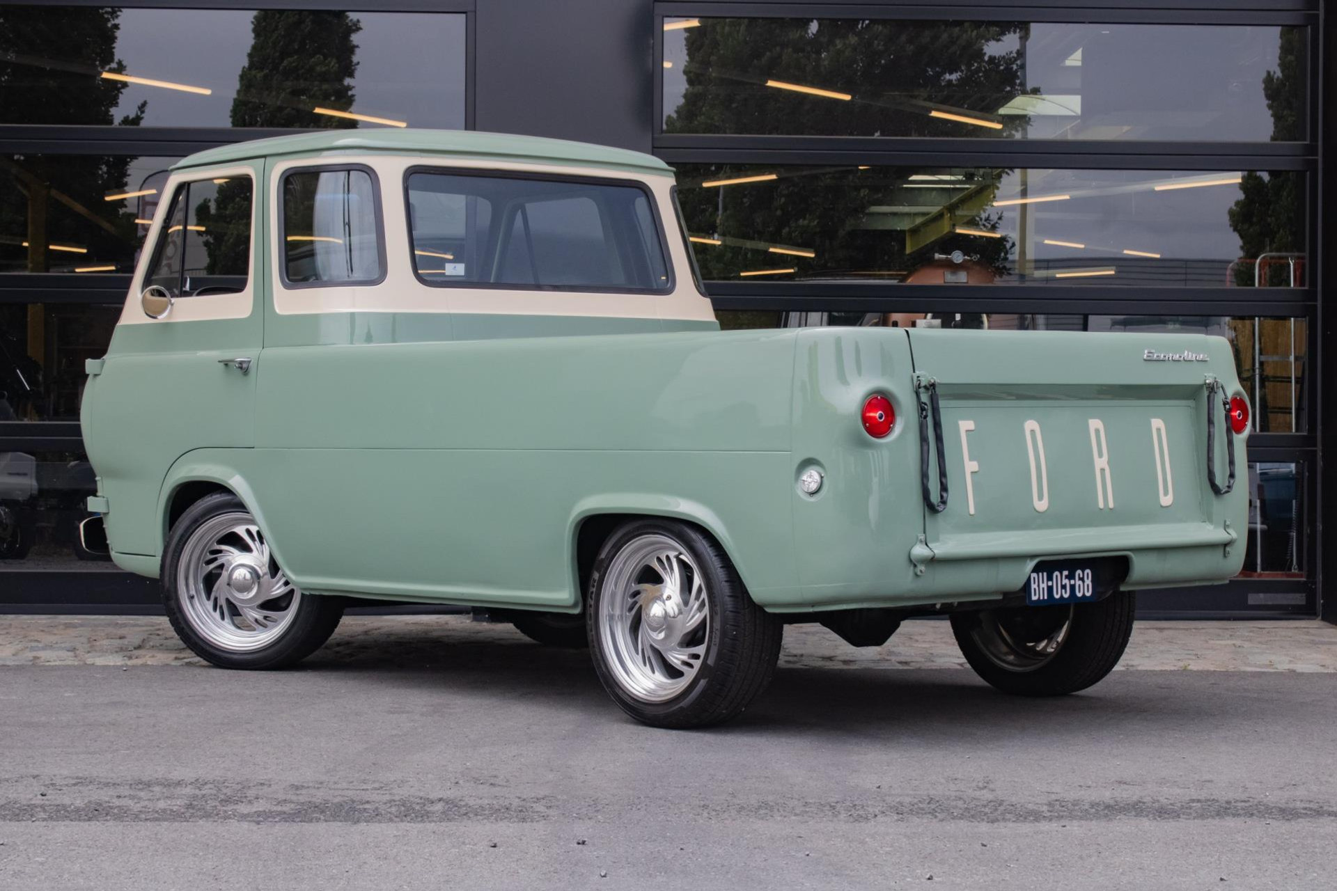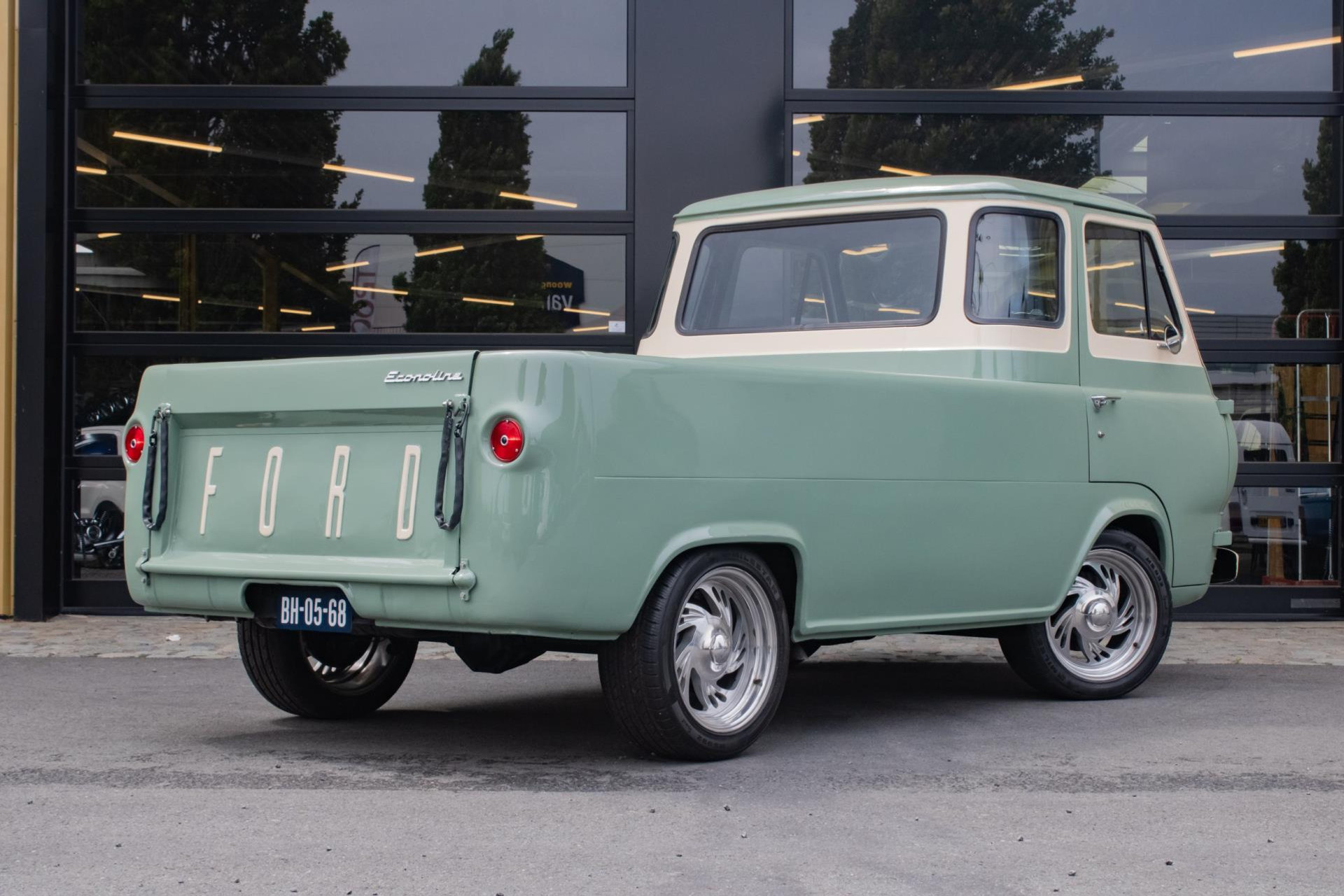 The paint is done in a stylish light olive green colour, beautifully combined with white accents that emphasise the classic lines. The cargo bay has been completely rebuilt with wood parts and aluminium strips, giving it an artisanal and high-quality look. As a finishing touch, this pick-up is fitted with Eagle Alloys alloy wheels and chrome mirrors, adding to its retro character.
