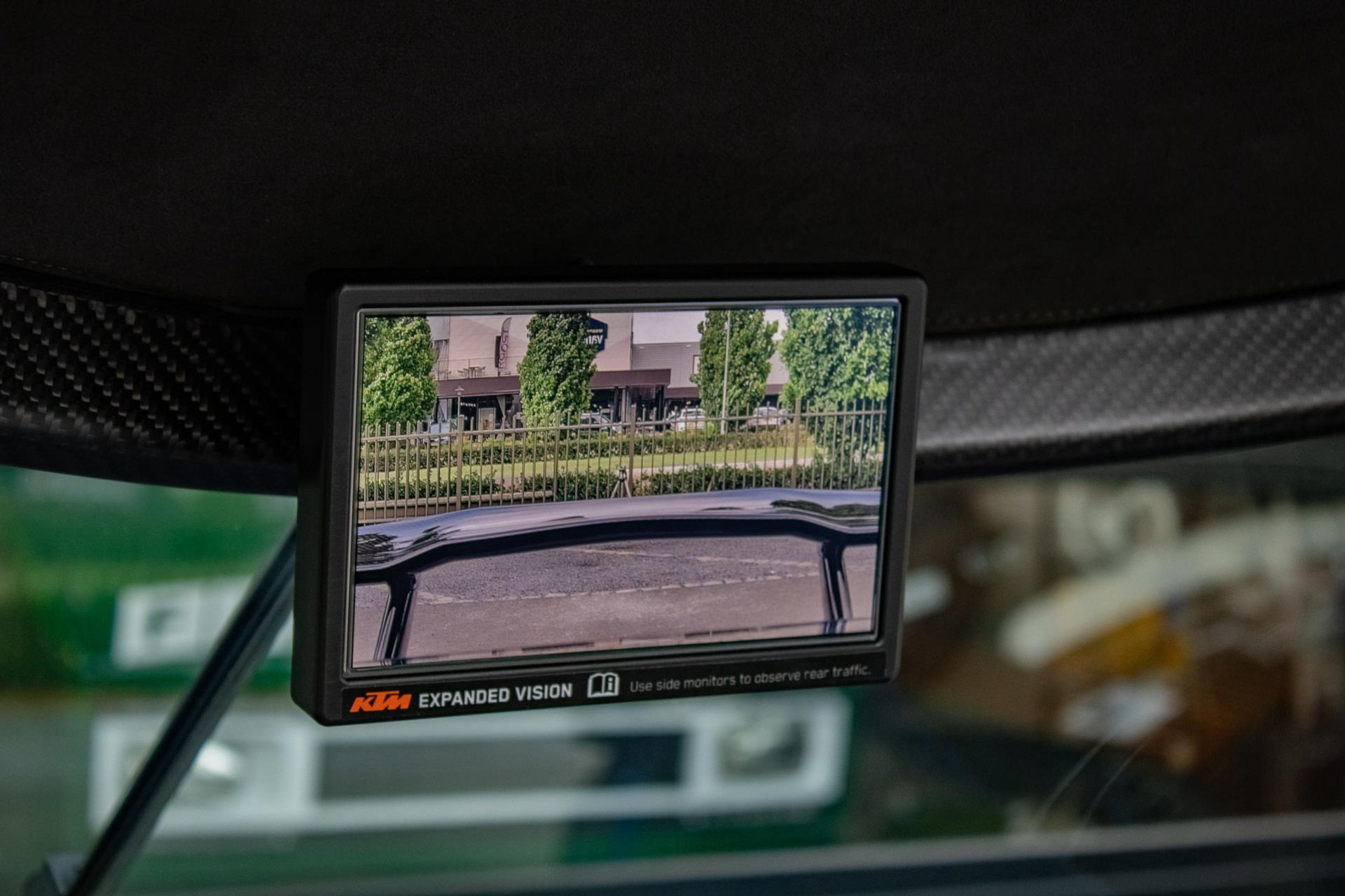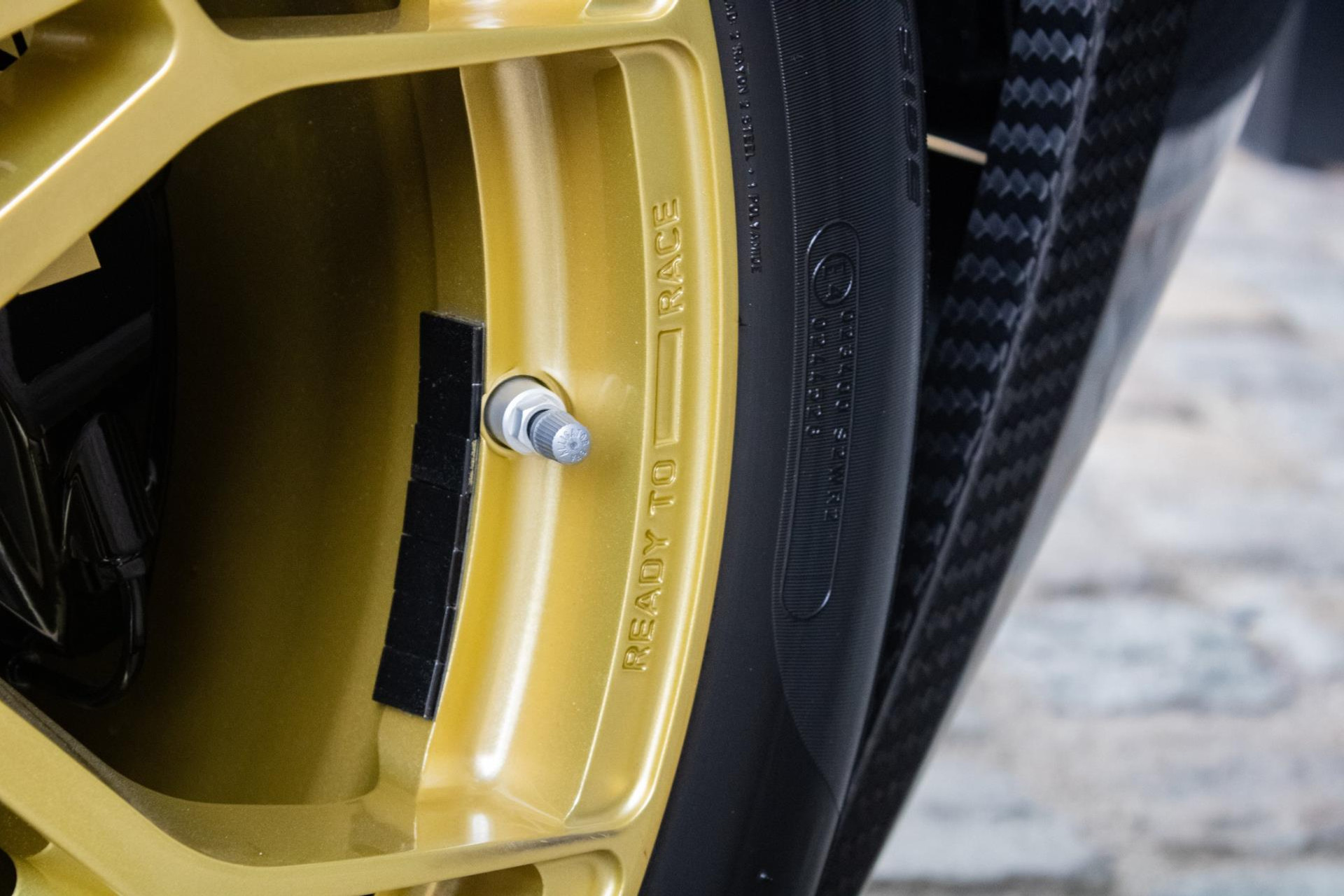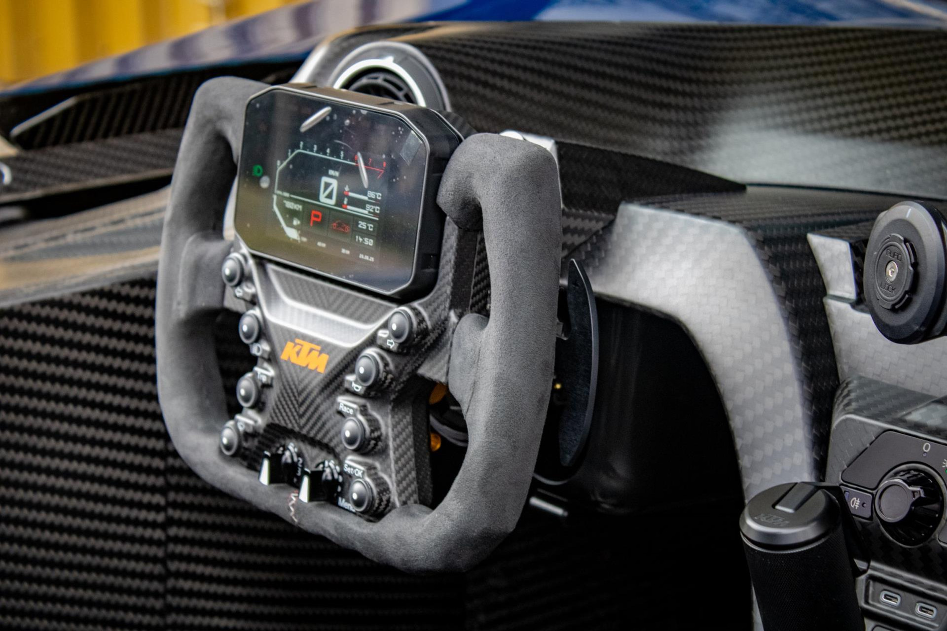 Dieses Exemplar hat nur 27 Testkilometer auf dem Kilometerzähler und ist in absolutem Neuzustand. Das Fahrzeug wurde auch im Detail mit exklusiven goldfarbenen Akzenten personalisiert: So sind die Felgen in Gold Gloss lackiert, inklusive der KTM-Logos auf den Radnabenabdeckungen. Die Bremssättel sind ebenfalls in RAL 9005 schwarz mit goldenen Logos ausgeführt. Darüber hinaus sind die Aufhängung, die Embleme (innen und außen), die Nähte der Sitze, die Abschleppöse und die Plakette „100 Limited Edition“ in Gold ausgeführt. Der GT-XR fährt auf Pirelli P ZERO TROFEORACE Semi-Slicks, die auf 19-Zoll-Reifen vorne und 20-Zoll-Reifen hinten montiert sind.