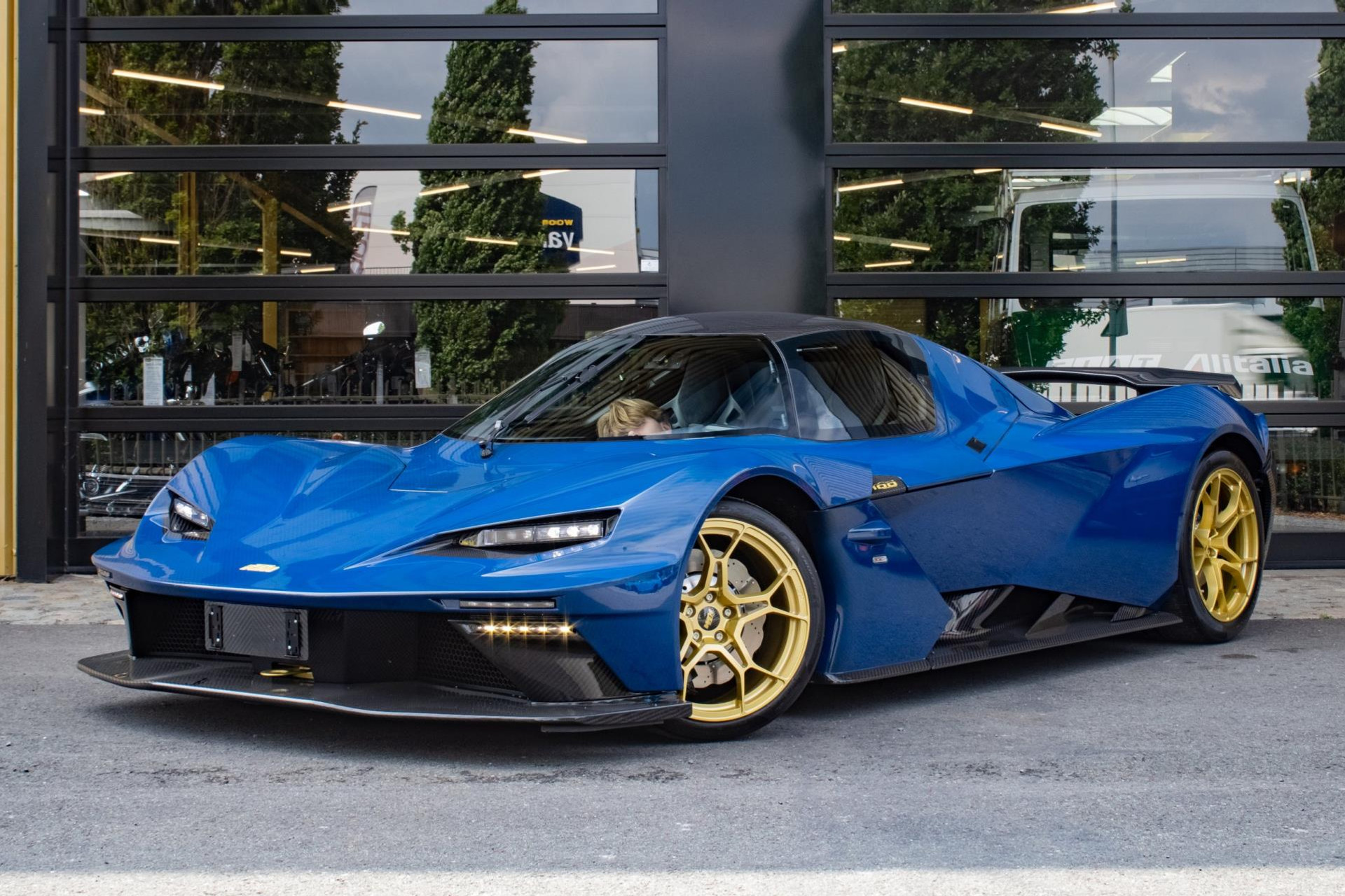 Ein einzigartiger und neuer KTM X-BOW GT-XR, Nummer 47 von nur 100 produzierten Fahrzeugen weltweit. Dieses straßenzugelassene Hypercar ist in einer exklusiven, einmaligen Lackierung namens Colored Carbon Spielberg Blue lackiert. Der Lack hat eine Lichtdurchlässigkeit von 30,47%, so dass die gesamte Karbonkarosserie in einem tiefen, metallischen Blau leuchtet. Diese Lackierung hat einen Wert von 35.000 Euro und wurde nur einmal aufgetragen - dieses Exemplar ist also buchstäblich einzigartig: ein Unikat.