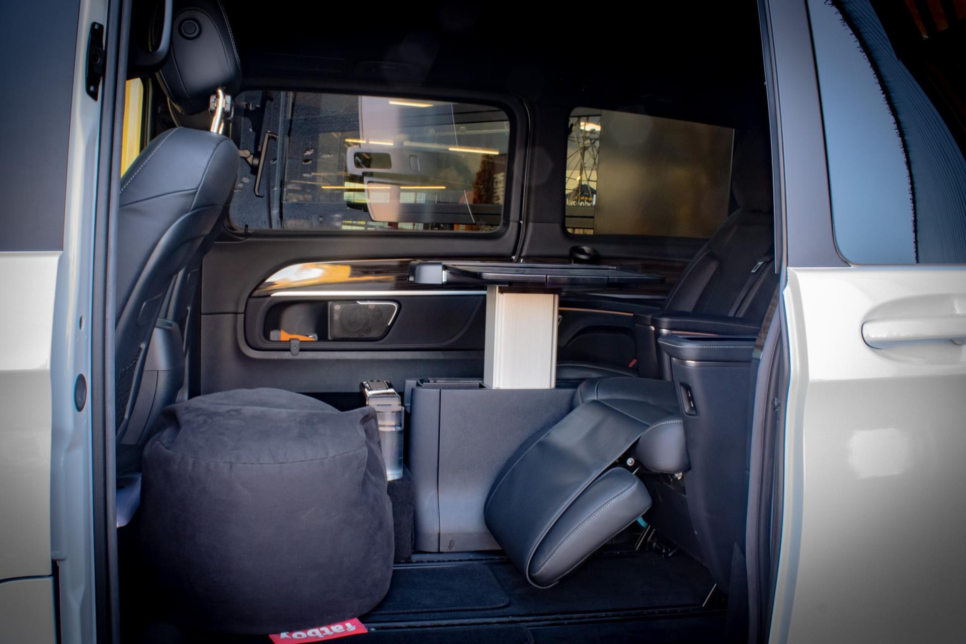 Achterin stap je een wereld binnen die voelt als een privéjet op wielen. De Maybach VIP-stoelen zijn volledig elektrisch verstelbaar, verwarmd, geventileerd en ontworpen om pure rust te bieden. Luxe leder, contrasterend stiksel, sfeerverlichting: alles ademt high-end comfort. De extra Fatboy-poefs creëren een rijdende lounge — perfect om te relaxen, achterover te leunen en de rit écht te beleven.