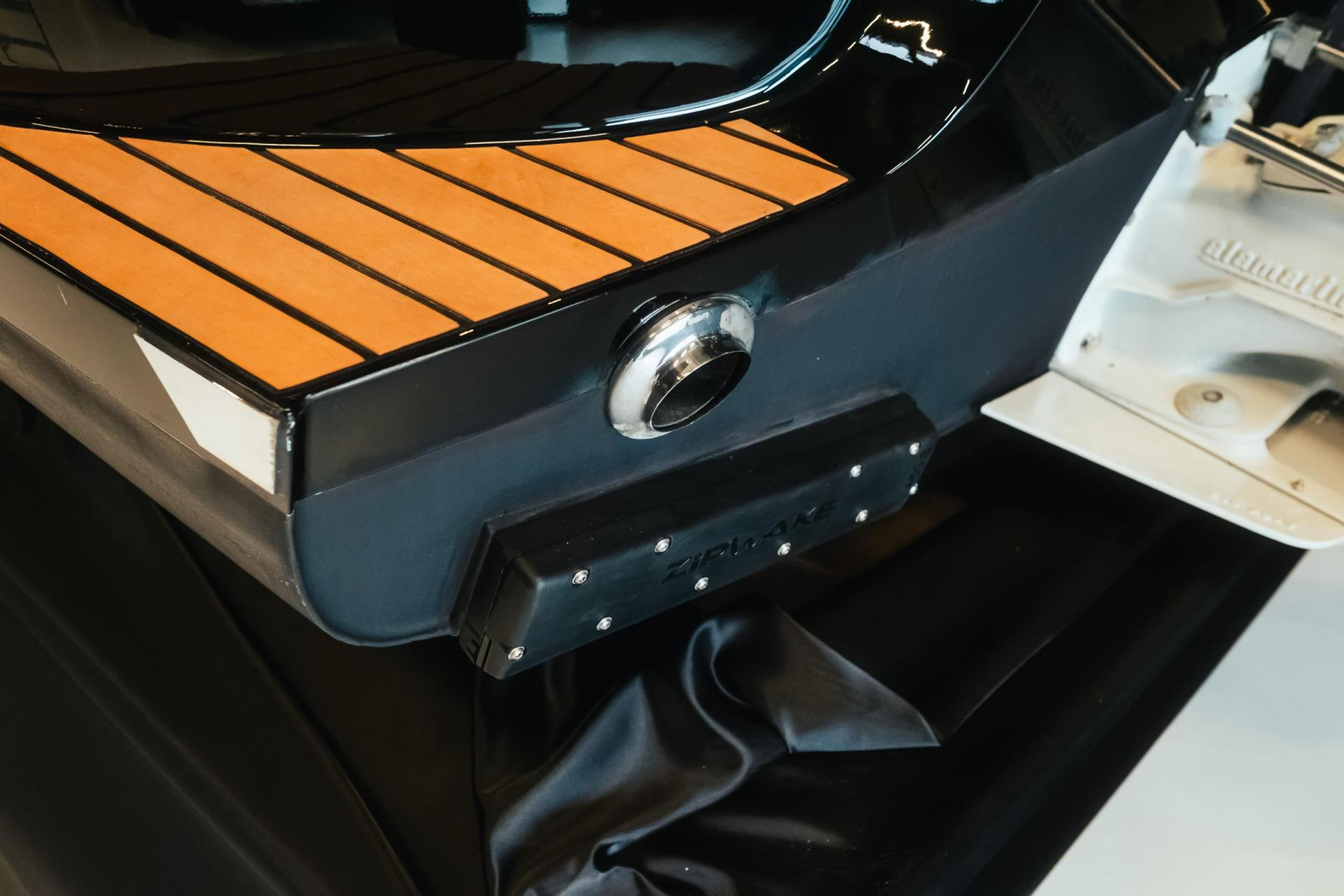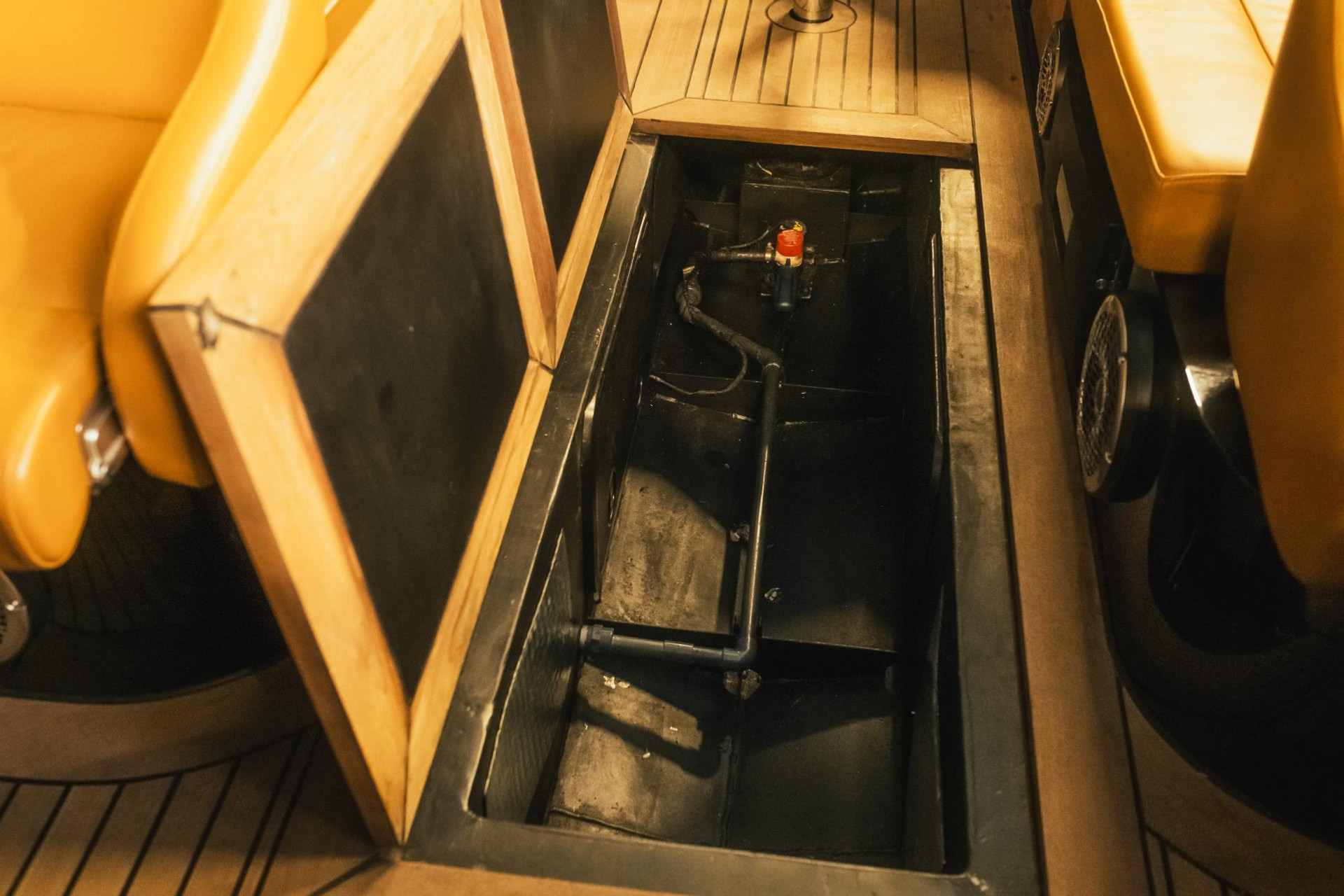 Das Interieur ist ebenso beeindruckend wie das Exterieur. Hellbraune Cognac-Lederpolster, stimmungsvolle Beleuchtung und moderne Teak-Holz-Akzente schaffen eine luxuriöse, warme Atmosphäre. Die Yacht verfügt über eine Kabine, zwei bequeme Innenbänke, einen runden Sitzbereich mit Tisch am Achterdeck, einen integrierten Kühlschrank und Polster für maximalen Komfort.