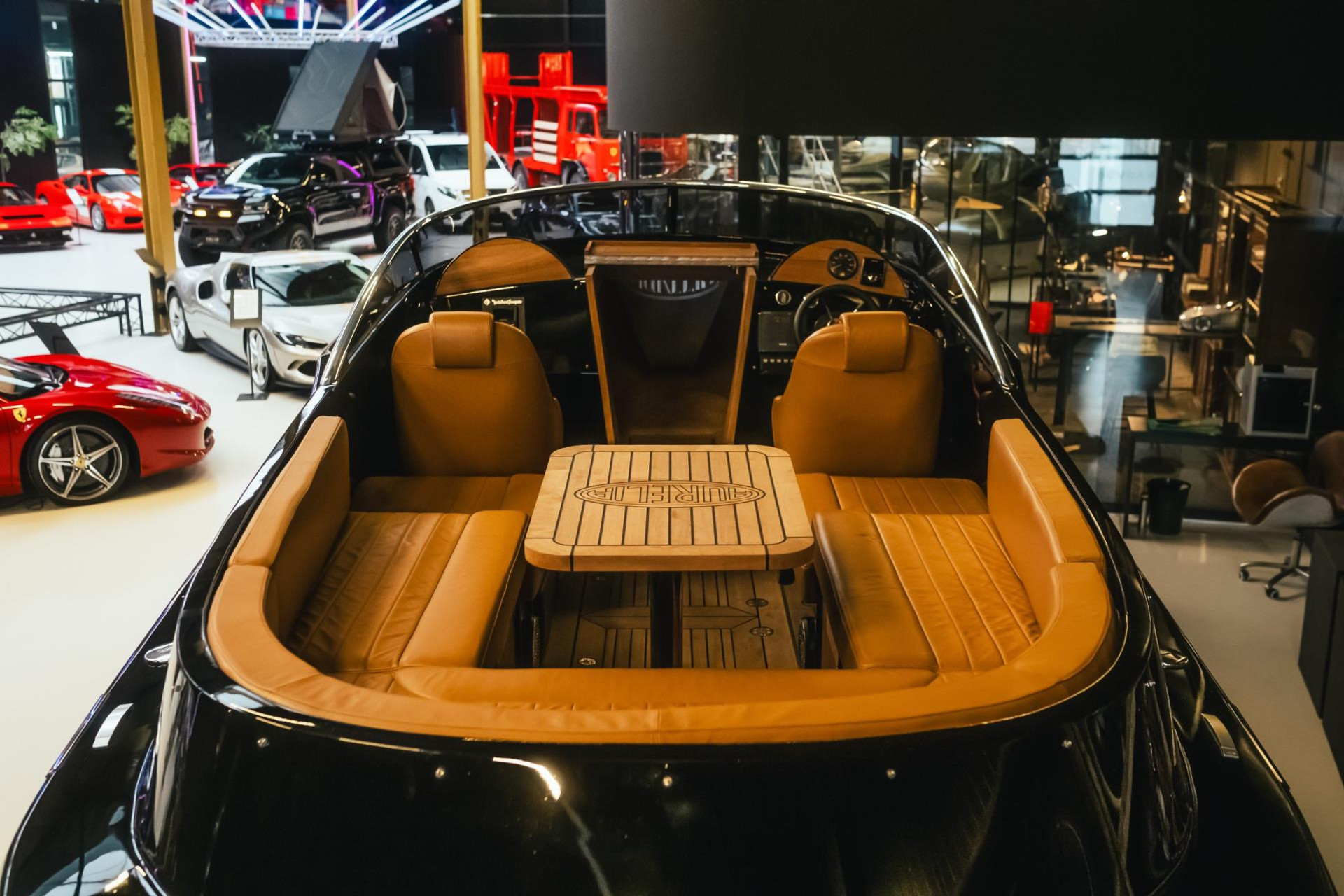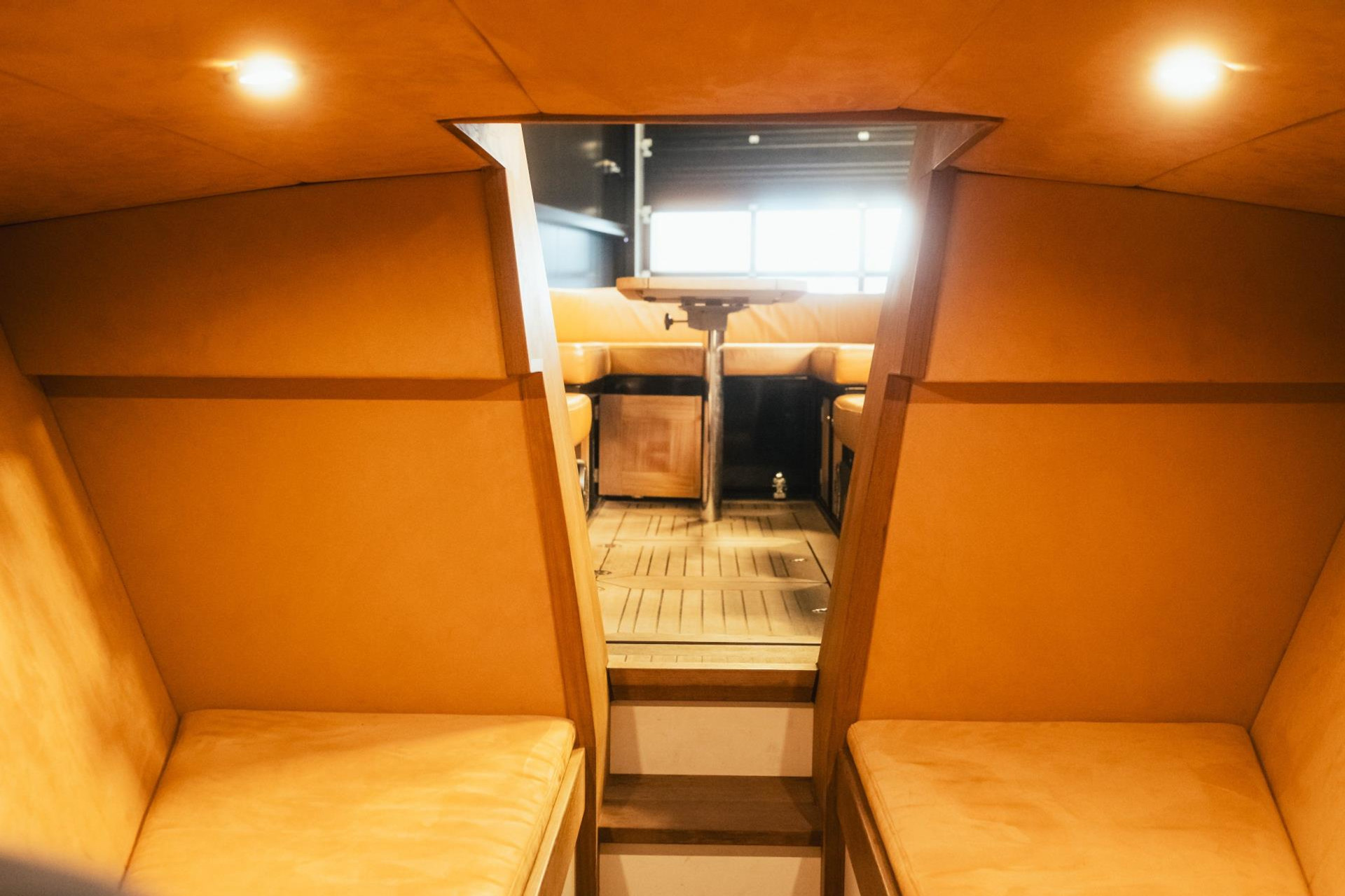Het interieur is even indrukwekkend als het exterieur. Lichtbruine cognac-lederen bekleding, sfeerverlichting en een moderne houten afwerking creëren een warme en luxueuze sfeer. De boot beschikt over één hut, twee comfortabele banken binnen, een gezellige ronde zitgroep met tafel op het achterdek, een geïntegreerde koelkast en kussens voor ultiem comfort.